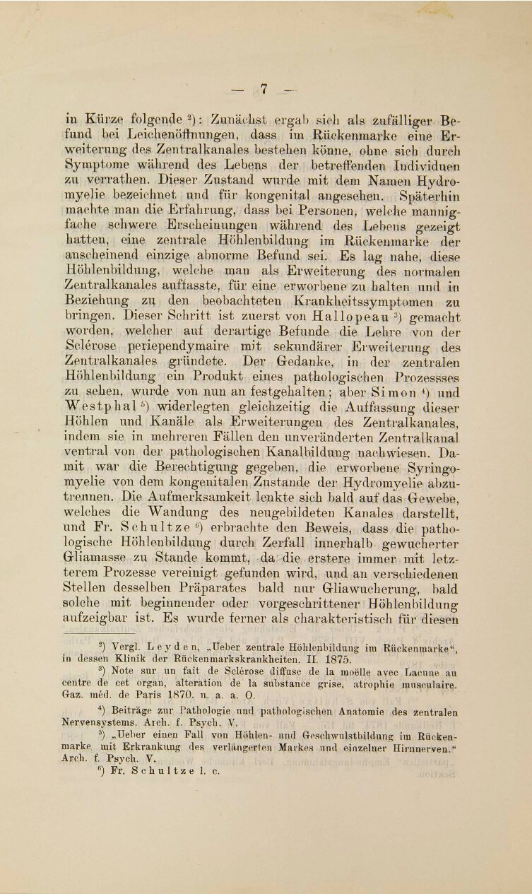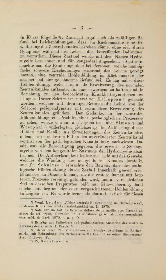 in Kürze folgende ): Zunächst ergab sich als zufälliger Be fund bei Leichenöffnungen, dass im Rückenmarke eine Er weiterung des Zentralkanales bestehen könne, ohne sich durch Symptome während des Lebens der betreffenden Individuen zu verrathen. Dieser Zustand wurde mit dem Namen Hydro myelie bezeichnet und für kongenital angesehen. Späterhin machte man die Erfahrung, dass bei Personen, welche mannig fache schwere Erscheinungen während des Lebens gezeigt hatten, eine zentrale Höhlenbildung im Rückenmarke der anscheinend einzige abnorme Befund sei. Es lag nahe, diese Höhlenbildung, welche man als Erweiterung des normalen Zentralkanales auffasste, für eine erworbene zu halten und in Beziehung zu den beobachteten Krankheitssymptomen zu bringen. Dieser Schritt ist zuerst von Hallopeau) gemacht worden, welcher auf derartige Befunde die Lehre von der Sclérose periependymaire mit sekundärer Erweiterung des Zentralkanales gründete. Der Gedanke, in der zentralen Höhlenbildung ein Produkt eines pathologischen Prozessses zu sehen, wurde von nun an festgehalten; aber Simon) und Westphal) widerlegten gleichzeitig die Auffassung dieser Höhlen und Kanäle als Erweiterungen des Zentralkanales, indem sie in mehreren Fällen den unveränderten Zentralkanal ventral von der pathologischen Kanalbildung nachwiesen. Da mit war die Berechtigung gegeben, die erworbene Syringo myelie von dem kongenitalen Zustande der Hydromyelie abzu trennen. Die Aufmerksamkeit lenkte sich bald auf das Gewebe, welches die Wandung des neugebildeten Kanales darstellt, und Fr. Schultze) erbrachte den Beweis, dass die patho logische Höhlenbildung durch Zerfall innerhalb gewucherter Gliamasse zu Stande kommt, da die erstere immer mit letz terem Prozesse vereinigt gefunden wird, und an verschiedenen Stellen desselben Präparates bald nur Gliawucherung, bald solche mit beginnender oder vorgeschrittener Höhlenbildung aufzeigbar ist. Es wurde ferner als charakteristisch für diesen