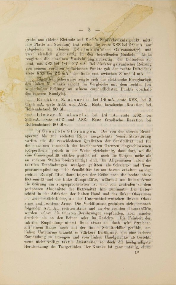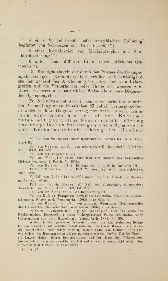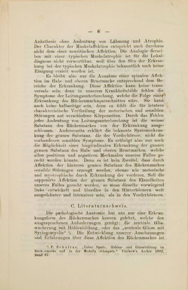Sensibilitätsstörungen Prager med. Wochenschr. 1882. Beitrag zur Lehre von der sogenannten partiellen Empfindungs lähmung. Berl. klin. Wochenschr. 1884. Ein Fall von zentraler Gliomatose (Syringomyelie) des Halsmarkes. Deutsche med Wochenschr 1884 1) Weshalb auch die Diagnose von Remak (1. c.) angefochten wurde.