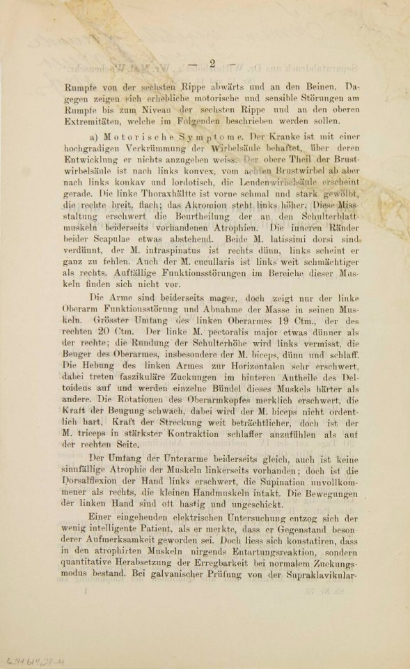 a) Motorische Symptome. Der Kranke ist mit einer hochgradigen Verkrümmung der Wirbelsäule behaftet, über deren Entwicklung er nichts anzugeben weiss. Der obere Theil der Brust wirbelsänle ist nach links konvex, vom achten Brustwirbel ab aber nach links konkav and lordotisch, die Lendenwirbelsäule erscheint gerade. Die linke Thoraxhälfte ist vorne schmal and stark gewölbt, die rechte breit, flach; das Akromion steht links höher. Diese Miss staltung erschwert die Beurtheilung der an den Schulterblatt muskeln beiderseits vorhandenen Atrophien. Die inneren Ränder beider Scapulae etwas abstehend. Beide M. latissimi dorsi sind verdünnt. der M. intraspinatus ist rechts dünn, links scheint er ganz zu fehlen. Auch der M. encullaris ist links weit schmächtiger als rechts. Auffällige Funktionsstörungen im Bereiche dieser Mas keln finden sich nicht vor.