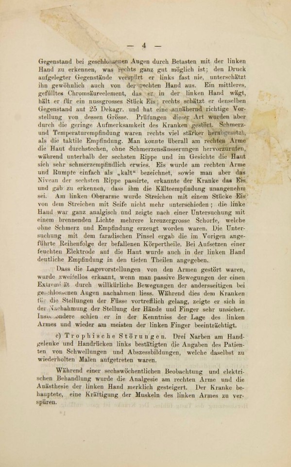 Die sensible Störung ist wesentlich als partielle" Empfindungslähmung zu bezeichnen, da über dem ganzen Gebiete der Affektion Schmerz- und Temperaturempfindung weit auffälliger als die Tastempfindungen gelitten haben. In dem Bereiche der linken Hand besteht hochgradige Herab setzung aller Empfindungsqualitäten; ebendort, wo die sen sible Störung am stärksten entwickelt ist, ist eine Beein trächtigung der trophischen Funktionen, eine Neigung zu Abszessbildungen auffällig, welche indess als Folgen unbeach teter Schädlichkeiten auf die Anästhesie zurückgeführt werden könnten. Der Verlauf der Erkrankung ist ein mit Schwankungen progressiver, ein ätiologisches Moment nicht bekannt.