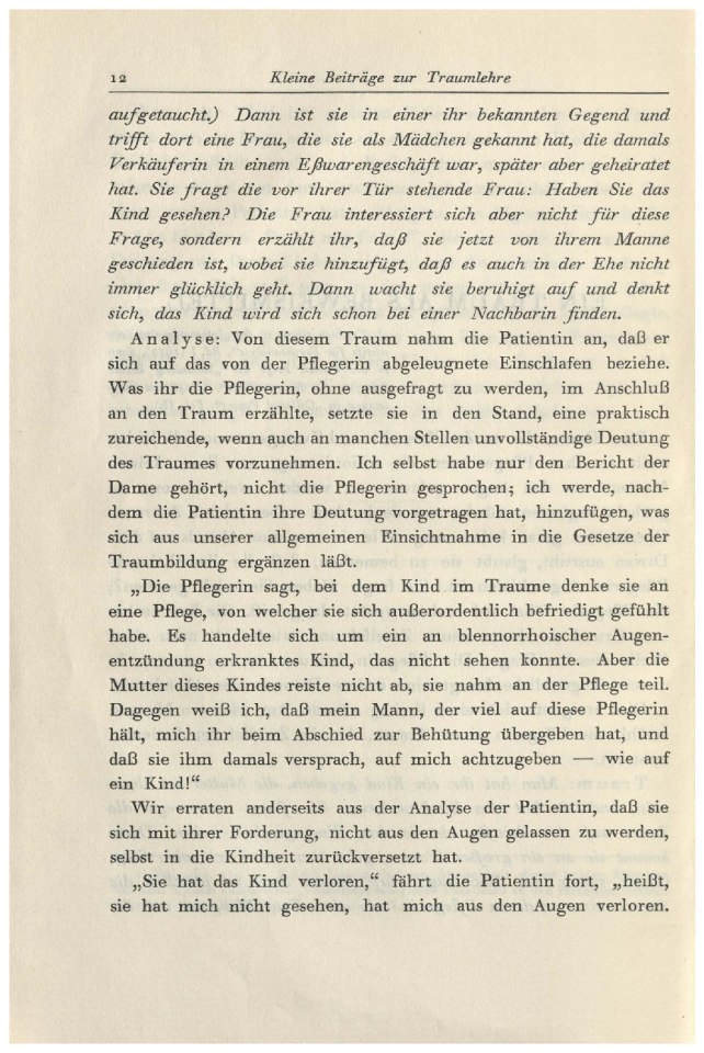 sich, das Kind wird sich schon bei einer Nachbarin finden.Analyse: Von diesem Traum nahm die Patientin an, daß er