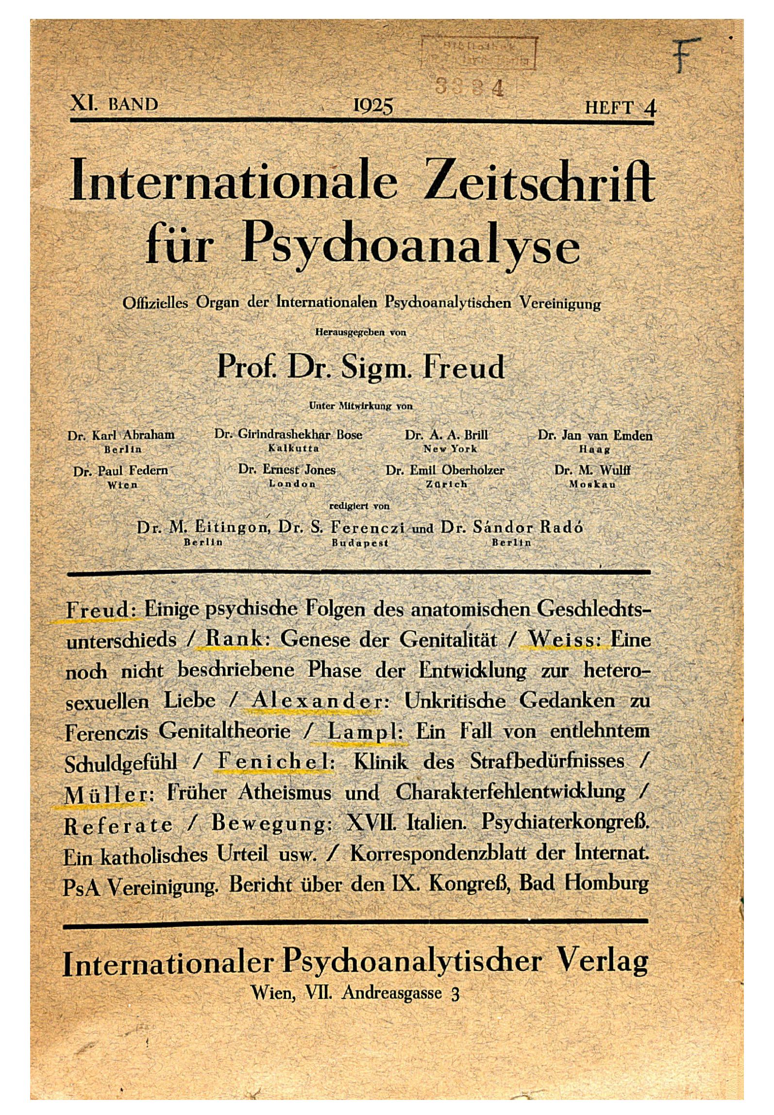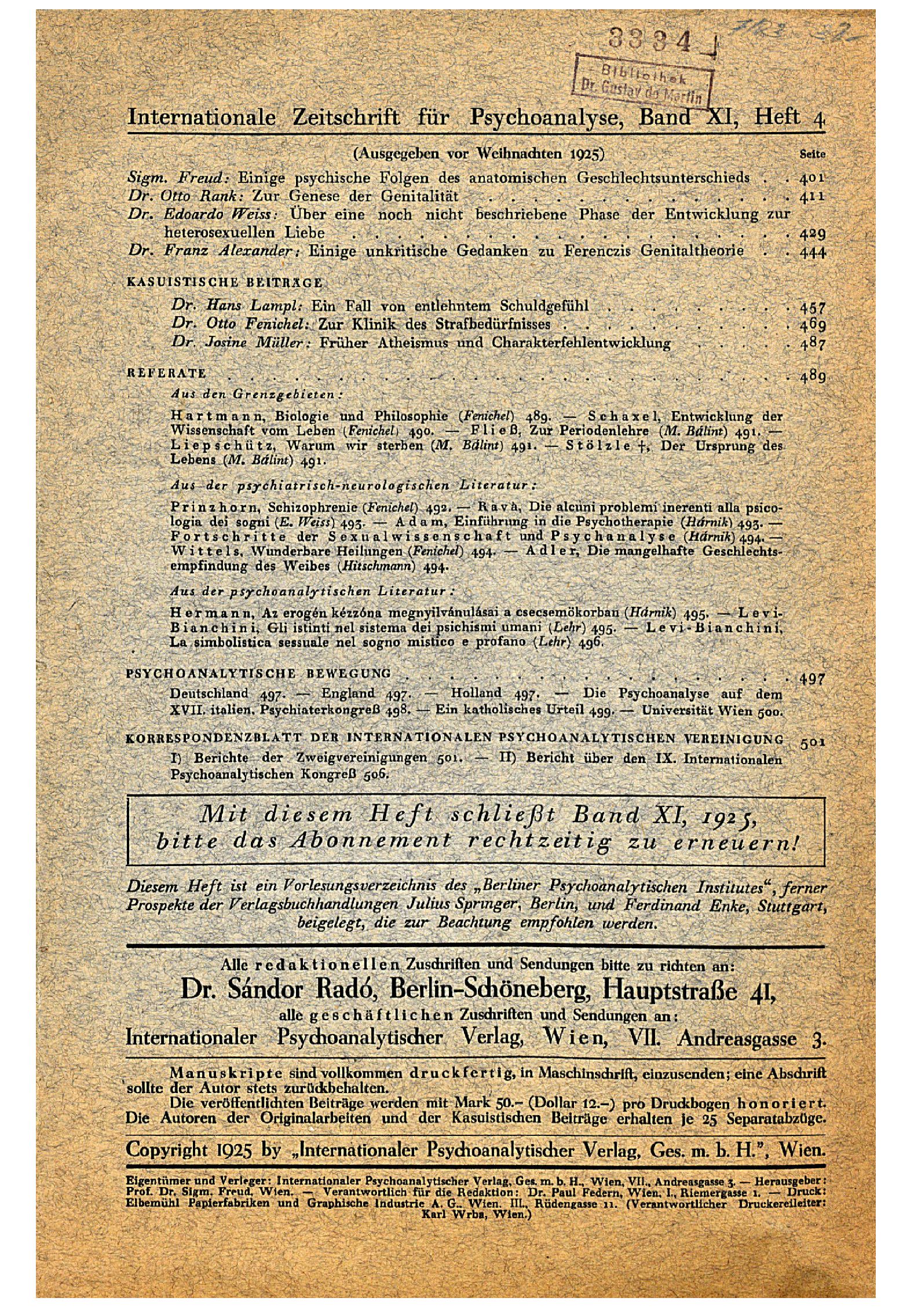 Copyright 1925 by Internationaler Psychoanalytischer Verlag, Ges. m. b. H.", Wien.