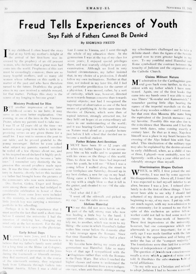 Freud, Sigmund 1931-041/1931 Freud Tells Experiences of Youth EMANU-EL, 36 (72), 1931, 20 30–31 Fertig Fertig Ganz fertig / zutreffend Fehlt Fehlt Teilweise - EB