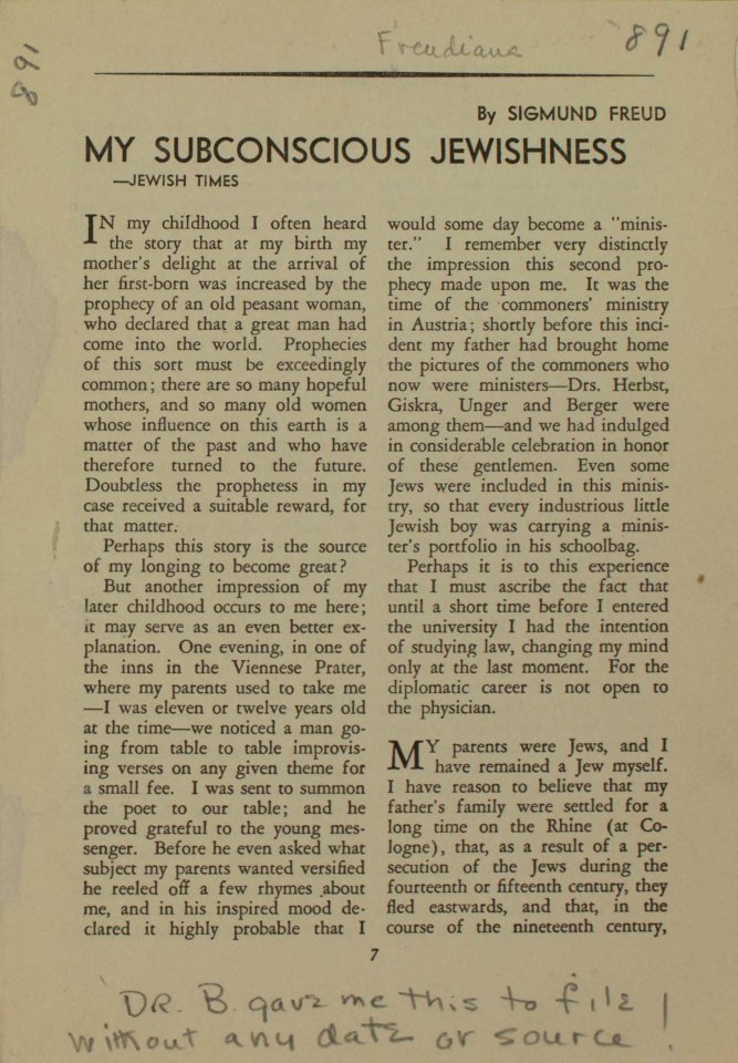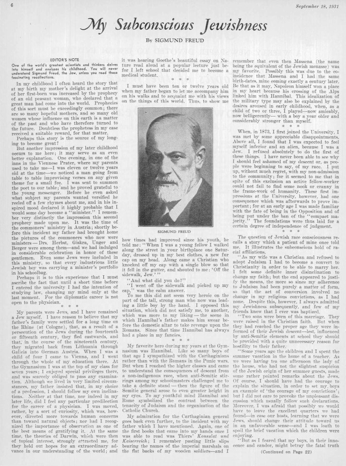 Freud, Sigmund 1931-041/1931 My Subconscious Jewishness The Sentinel, 83, 1931, 12 6 & 22 Fertig Fertig Ganz fertig / zutreffend Fehlt Fehlt Ganz fertig / zutreffend EB