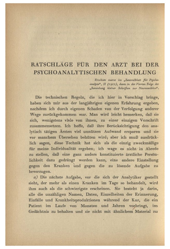 Freud, Sigmund 1912-003/1943 1912e 10589 Ratschläge für den Arzt bei der psychoanalytischen Behandlung GW 8 375–387 Fertig Nicht erforderlich/ Nicht erforderlich/ Nicht erforderlich/ Nicht erforderlich/ Nicht erforderlich/