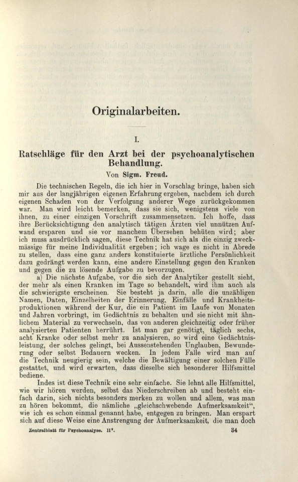 Freud, Sigmund 1912-003/1912 1912e 1912-04 10589 Ratschläge für den Arzt bei der psychoanalytischen Behandlung Zb 2, 1912, 9 483–489 Fertig Fertig Ganz fertig / zutreffend Fehlt Fehlt Ganz fertig / zutreffend EB
