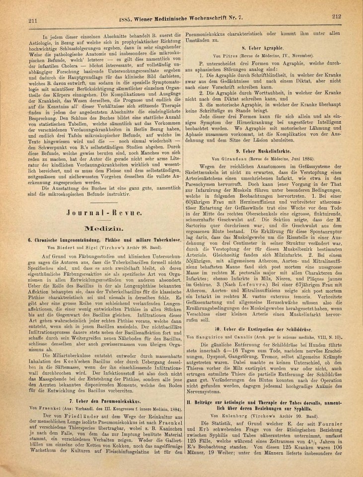 Freud, Sigmund | 1885-210/1885 | 1885p | 1885-16 | Rezension [unsigniert] von: Biedert und Sigel ›Chronische Lungenentzündung, Phthise und miliare Tuberkulose‹ | Wiener Medizinische Wochenschrift, 1885, 35, 7 | 211 | Fertig ✔ | Fertig ✔ | Ganz fertig / zutreffend ✔ | Fehlt ✖ | Fehlt ✖ | Ganz fertig / zutreffend ✔ | ✔ | EB | ✔ | ||