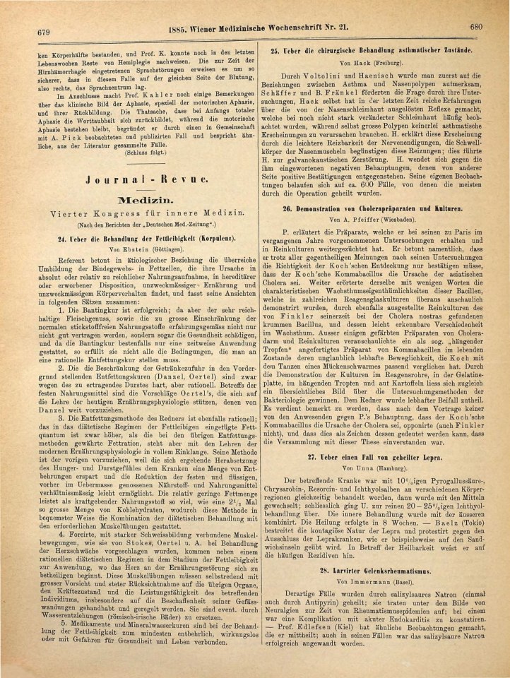 Freud, Sigmund | 1885-228/1885 | 1885hh | 1885-34 | Rezension [unsigniert] von: Ebstein (Göttingen) ›Über die Behandlung der Fettleibigkeit (Korpulenz)‹ | Wiener Medizinische Wochenschrift, 35, 1885, 21 | 679 | Fertig ✔ | Fertig ✔ | Ganz fertig / zutreffend ✔ | Fehlt ✖ | Fehlt ✖ | Ganz fertig / zutreffend ✔ | ✔ | EB | ✔ | ||