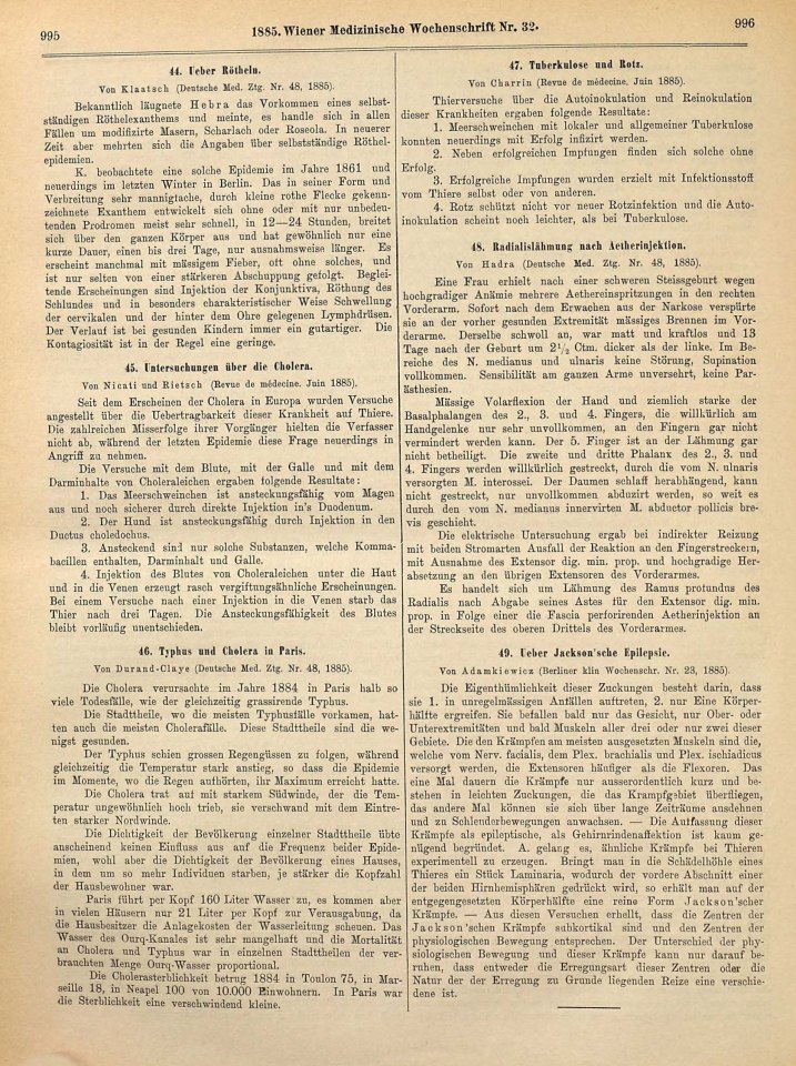 Freud, Sigmund 1885-252/1885 1885fff 1885-58 Rezension [unsigniert] von: Hadra ›Radialislähmung nach Ätherinjektion‹ Wiener Medizinische Wochenschrift, 35, 1885, 32 996 Fertig Fertig Ganz fertig / zutreffend Fehlt Fehlt Ganz fertig / zutreffend EB