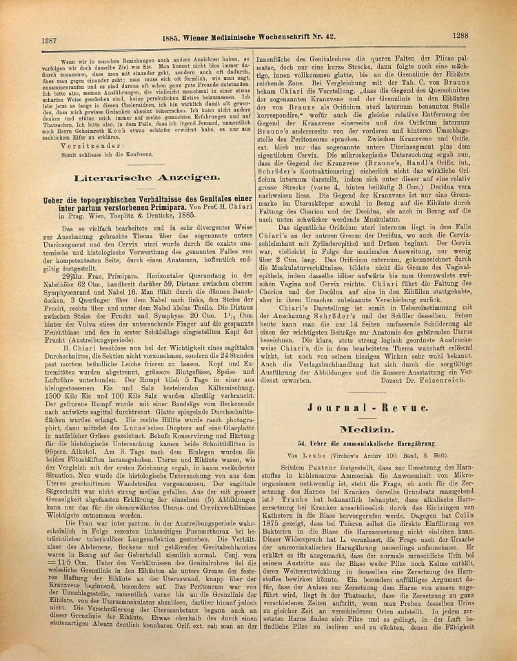 Freud, Sigmund | 1885-258/1885 | 1885lll | 1885-64 | Rezension [unsigniert] von: Leube ›Über die ammoniakalische Harngährung‹ | Wiener Medizinische Wochenschrift, 35, 1885, 42 | 1288–1289 | Fertig ✔ | Fertig ✔ | Ganz fertig / zutreffend ✔ | Fehlt ✖ | Fehlt ✖ | Ganz fertig / zutreffend ✔ | ✔ | EB | ✔ | ||