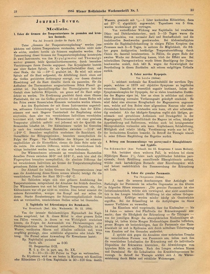 Freud, Sigmund | 1885-206/1885 | 1885l | 1885-12 | Rezension [unsigniert] von: Rossbach ›Naphthalin bei Erkrankungen des Darmkanals‹ | Wiener Medizinische Wochenschrift, 35, 1885, 1 | 19–20 | Fertig ✔ | Fertig ✔ | Ganz fertig / zutreffend ✔ | Fehlt ✖ | Fehlt ✖ | Ganz fertig / zutreffend ✔ | ✔ | EB | ✔ | ||