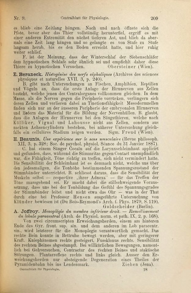 Freud, Sigmund | 1887-223/1887 | 1888l | Rezension von: Beraneck, E[dmond] ›Histogénése des nerfs céphaliques‹ | Centralblatt für Physiologie, 1, 1887, 9 | 209 | Fertig ✔ | Fertig ✔ | Ganz fertig / zutreffend ✔ | Fehlt ✖ | Fehlt ✖ | Ganz fertig / zutreffend ✔ | ✔ | EB | ✔ | |||