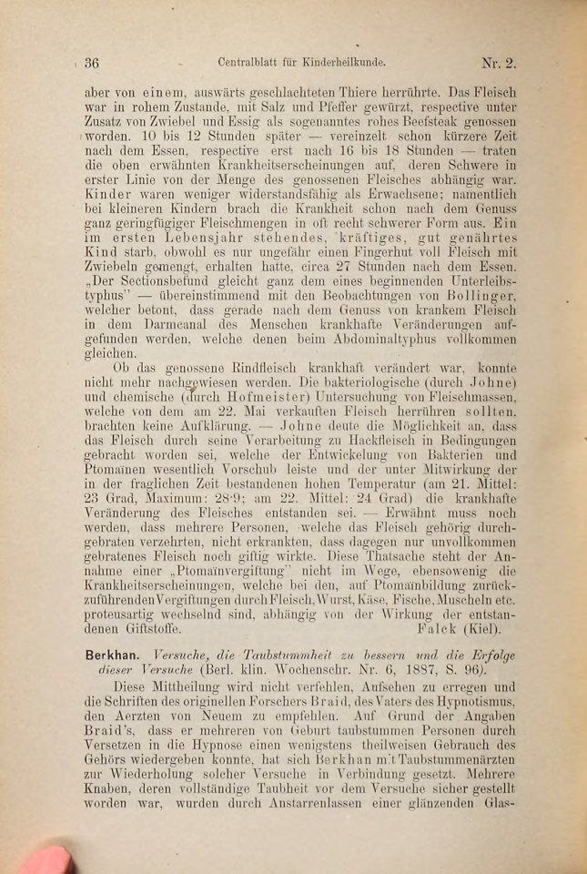Freud, Sigmund | 1887-208/1887 | 1887n | 1887-11 | Rezension von: Berkhan, [Oswald] ›Versuche, die Taubstummheit zu bessern und die Erfolge dieser Versuche‹ | Centralblatt für Kinderheilkunde, 1, 1887, 2 | 36–37 | Fertig ✔ | Fertig ✔ | Ganz fertig / zutreffend ✔ | Fehlt ✖ | Fehlt ✖ | Ganz fertig / zutreffend ✔ | ✔ | EB | ✔ | ||