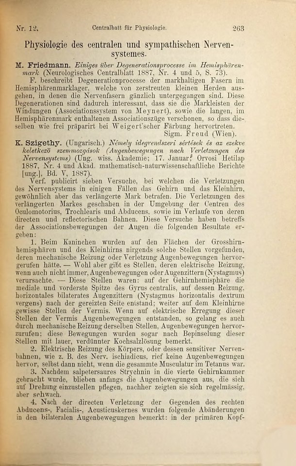 Freud, Sigmund | 1887-233/1887 | Rezension von: Friedmann, M[ax] ›Einiges über Degenerationsprocesse im Hemisphärenmark‹ | Centralblatt für Physiologie, 1, 1887, 12 | 263 | Fertig ✔ | Fertig ✔ | Ganz fertig / zutreffend ✔ | Fehlt ✖ | Fehlt ✖ | Ganz fertig / zutreffend ✔ | ✔ | EB | ✔ | ||||