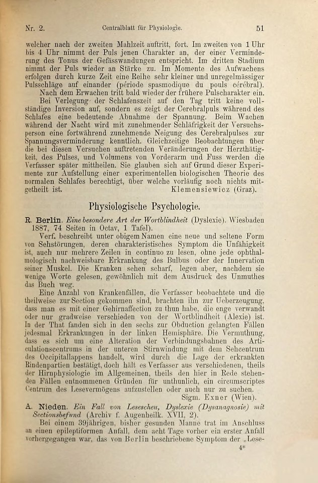 Rezension von: Nieden, [Friedrich] A[dolf] ›Ein Fall von Lesescheu, Dyslexie (Dysanagnosie) mit Sectionsbefund‹
