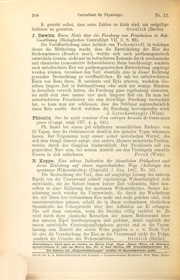 Freud, Sigmund | 1887-234/1888 | 1888q | Rezension von: Phisalix, [Césaire-Auguste] ›Sur les nerfs craniens d’un embryon humain de trente-deux jours‹ | Centralblatt für Physiologie, 1, 1887, 12 | 268 | Fertig ✔ | Fertig ✔ | Ganz fertig / zutreffend ✔ | ✖ | ✖ | ✖ | ✔ | ✔ | ||||