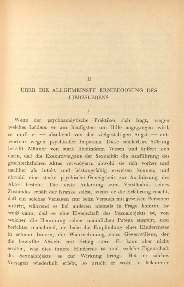 Freud, Sigmund (1912-005/1912): II. Über die allgemeine Erniedrigung des Liebeslebens. Jahrbuch für psychoanalytische und psychopathologische Forschungen, 1912, 4(1):40-50.