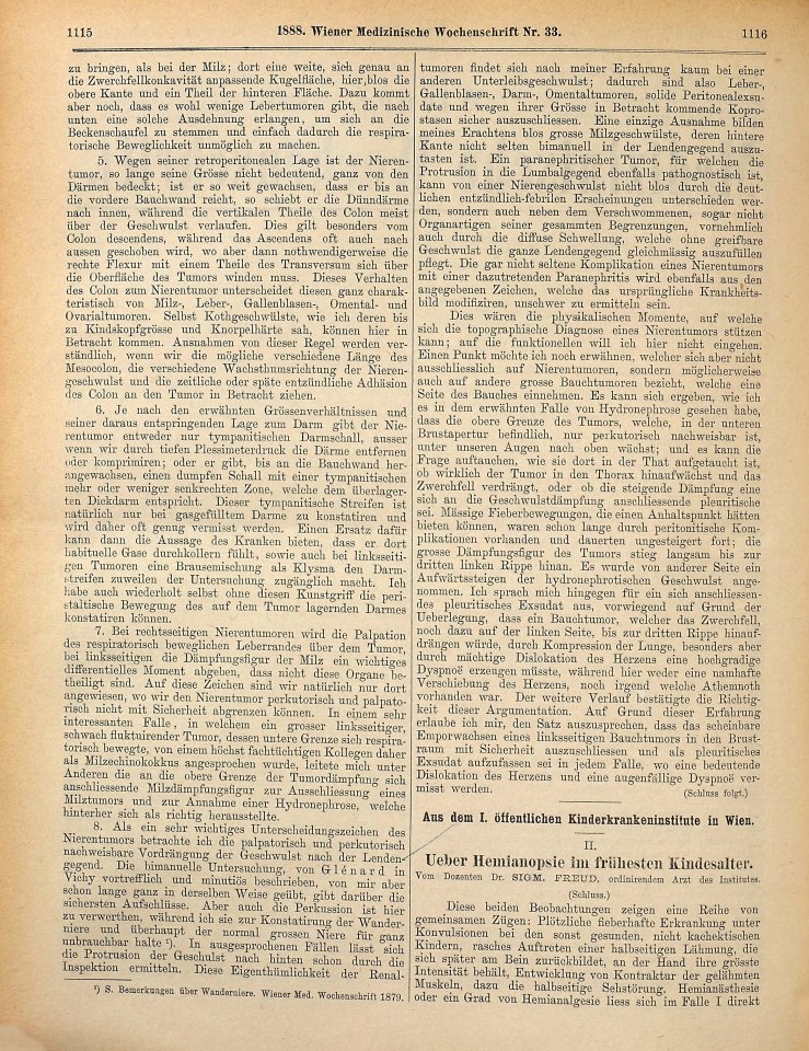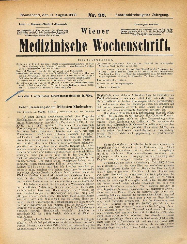 Freud, Sigmund | 1888-001/1888 | 1888a | 1888-09 | 10371 | Ueber Hemianopsie im frühesten Kindesalter | Wiener medizinische Wochenschrift, 38, 1888, 32 | 1081–1086 | Fertig ✔ | Fertig ✔ | Ganz fertig / zutreffend ✔ | Fehlt ✖ | Fehlt ✖ | Ganz fertig / zutreffend ✔ | ✔ | EB | ✔ | |