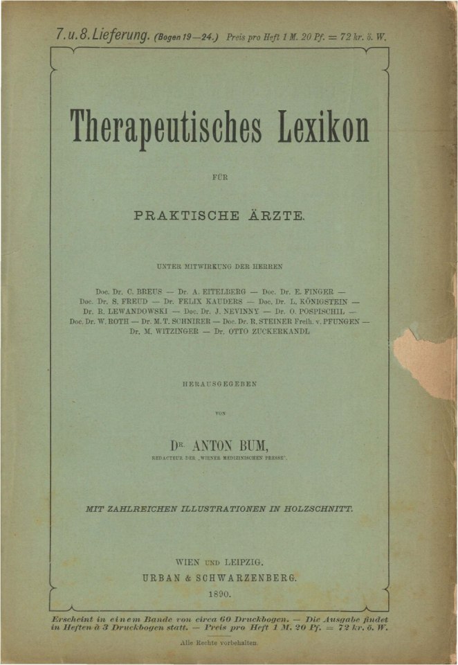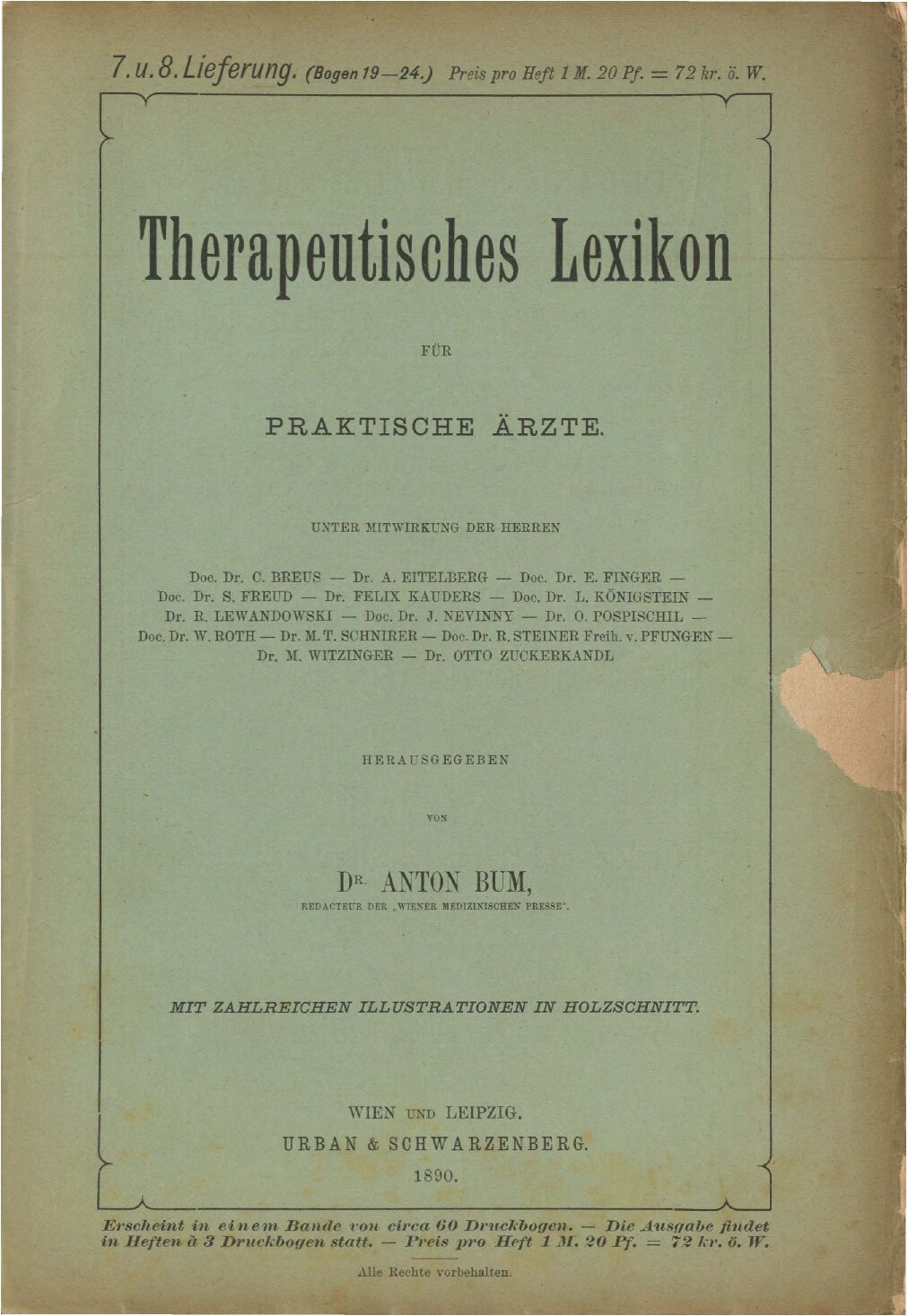 Das Therapeutische Lexikon erschien in 20 Lieferungen im Jahr 1890, lediglich das letzte Heft im Jahr 1891. Das Gesamtwerk wird mit 1891 datiert, Freuds Beitrag "Hypnose" erschien jedoch in der "7. u. 8. Lieferung", anhand des Schutzumschlages datierbar auf 1890. Aus diesem Grund weicht die Werksignatur von M-P/F/H 1891d ab.
