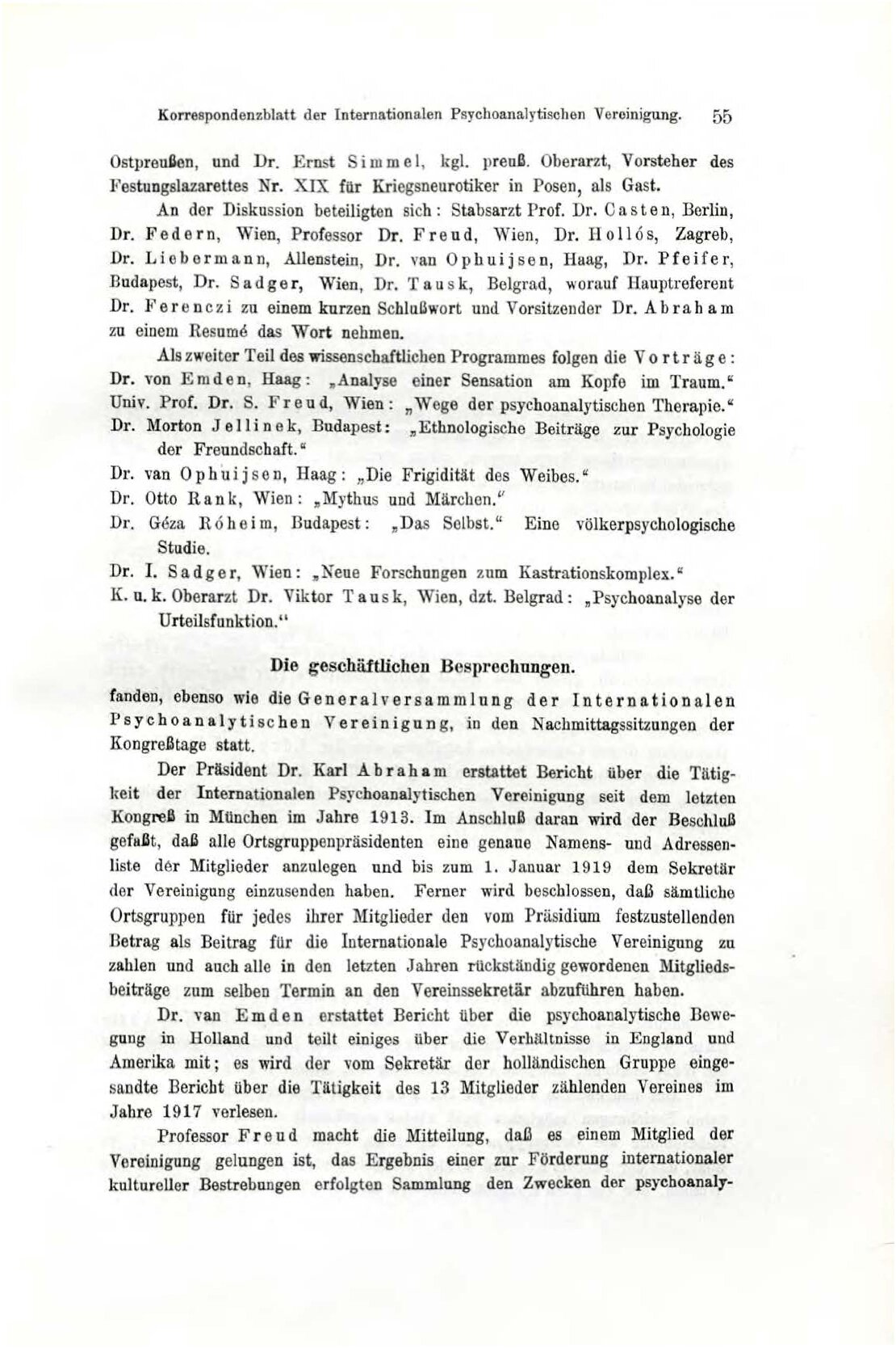Dr. van Emden erstattet Bericht über die psychoanalytische Bewe-