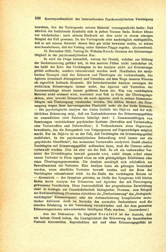 Reich, Wilhelm 1922-518/1922.2 3. Sitzung am 15. November 1922. Wilhelm Reich: Grenzender Erinnerungstätigkeit in der psychoanalytischen Kur IZP 8, 1922, 4 538–539 Fertig Fertig Ganz fertig / zutreffend Fehlt Fehlt Ganz fertig / zutreffend