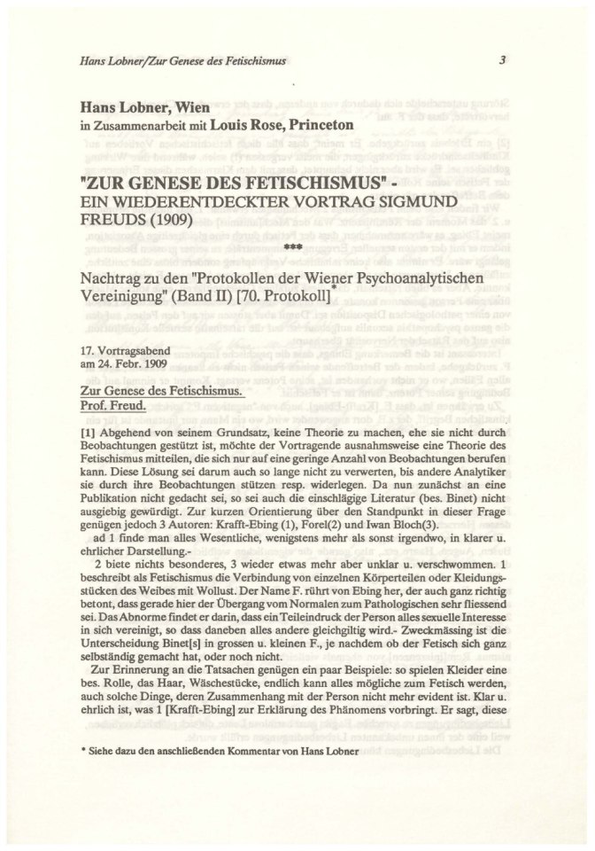 Protokoll der 17. Sitzung des 7. Jahres der Psychologischen Mittwoch-Gesellschaft am 24. Februar 1909. Sigmund Freud: Zur Genese des Fetischismus