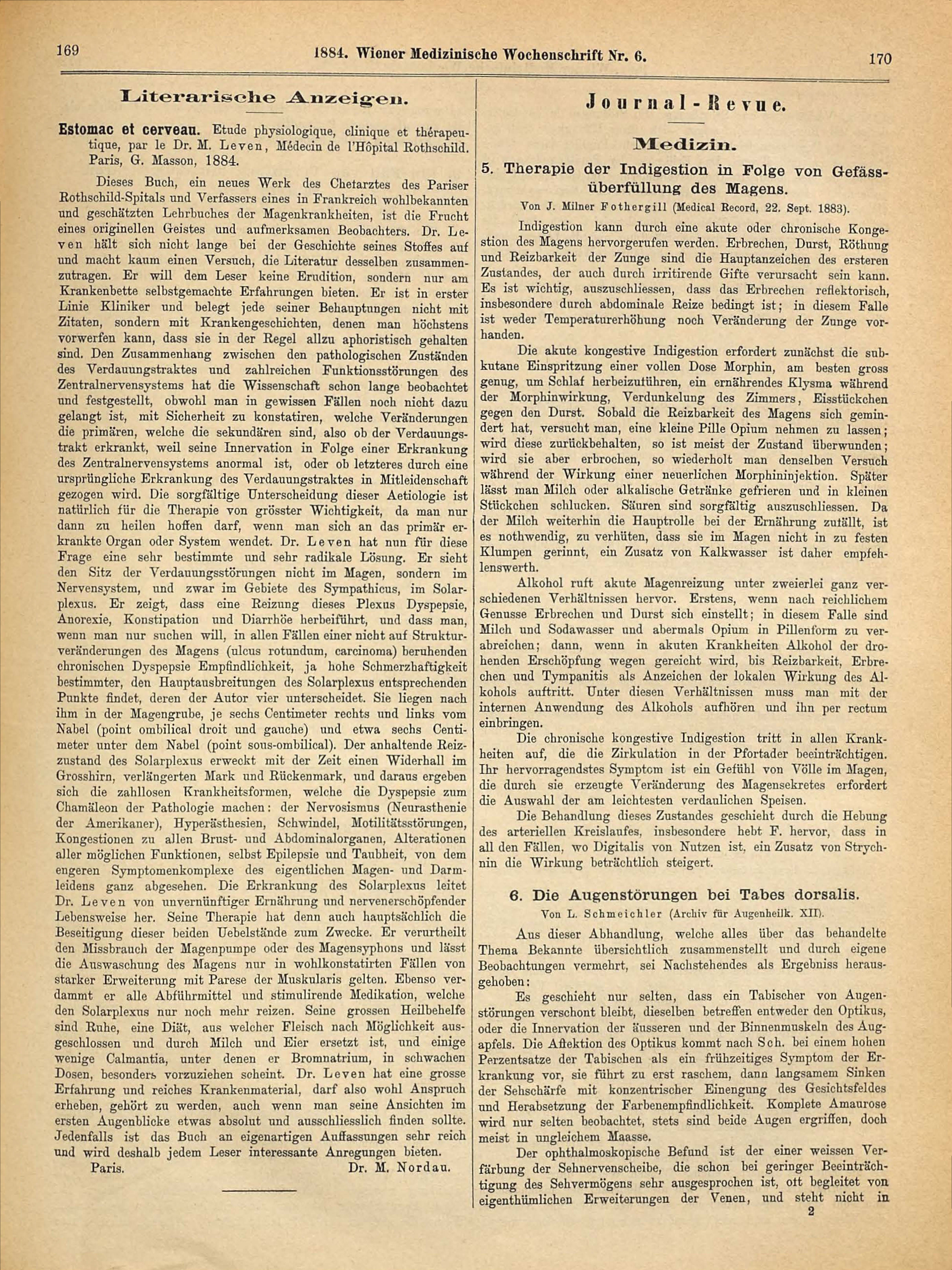 Rezension [unsigniert] von: Fothergill, J. Milner ›Therapie der Indigestion in Folge von Gefässüberfüllung des Magens‹ 1884-205/1884