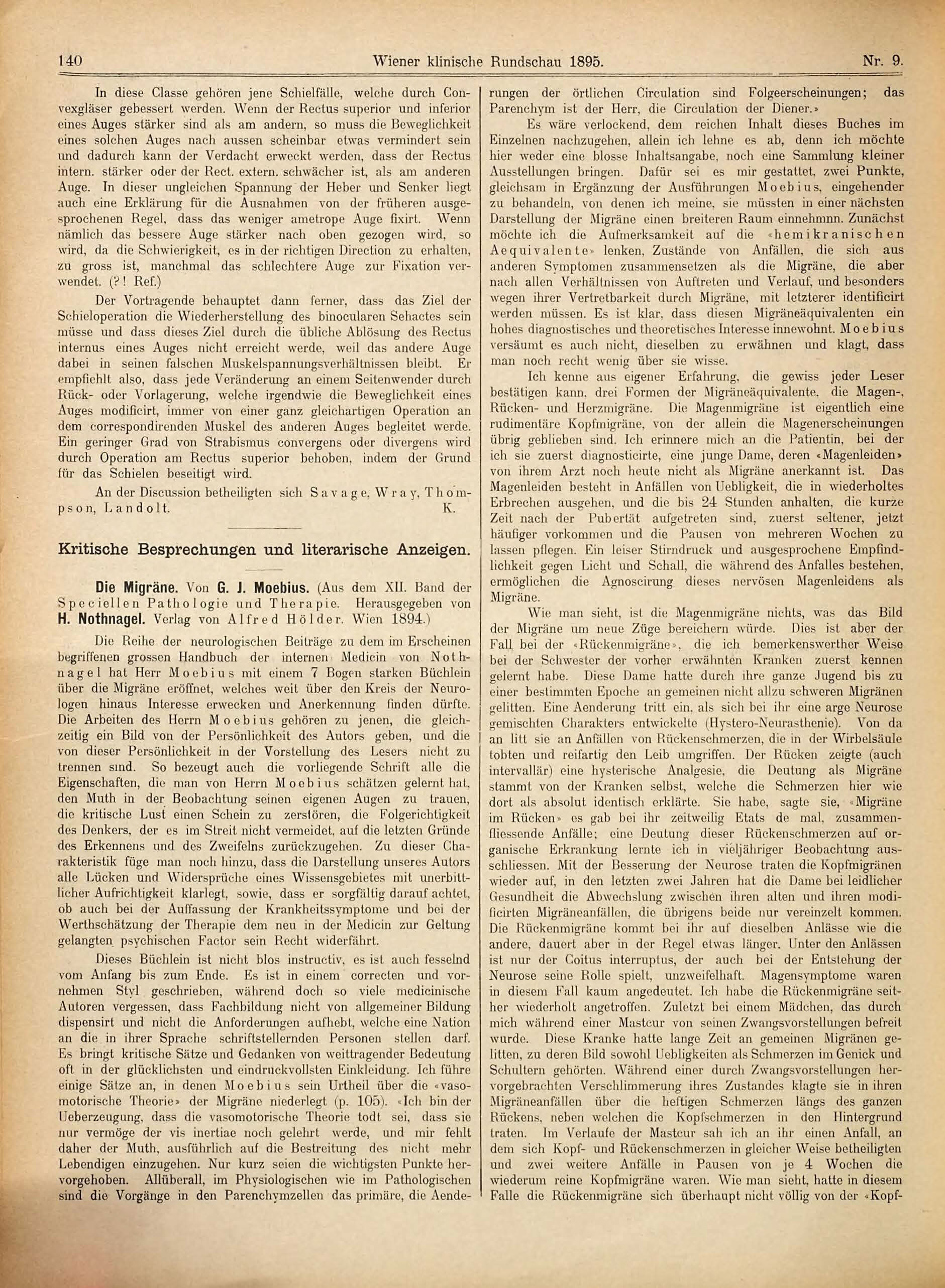 Die Migräne. Von G. J. Moebius. (Aus dem XII. Band der