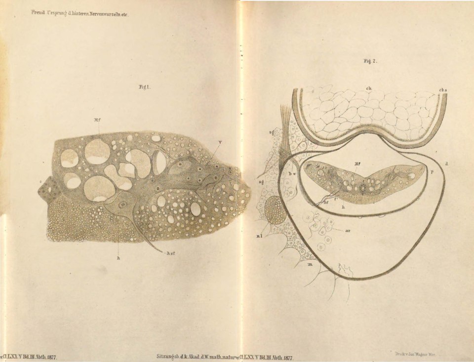 und „statuirt“, dass Fasern der hinteren Nervenwurzeln aus ihnen entspringen,