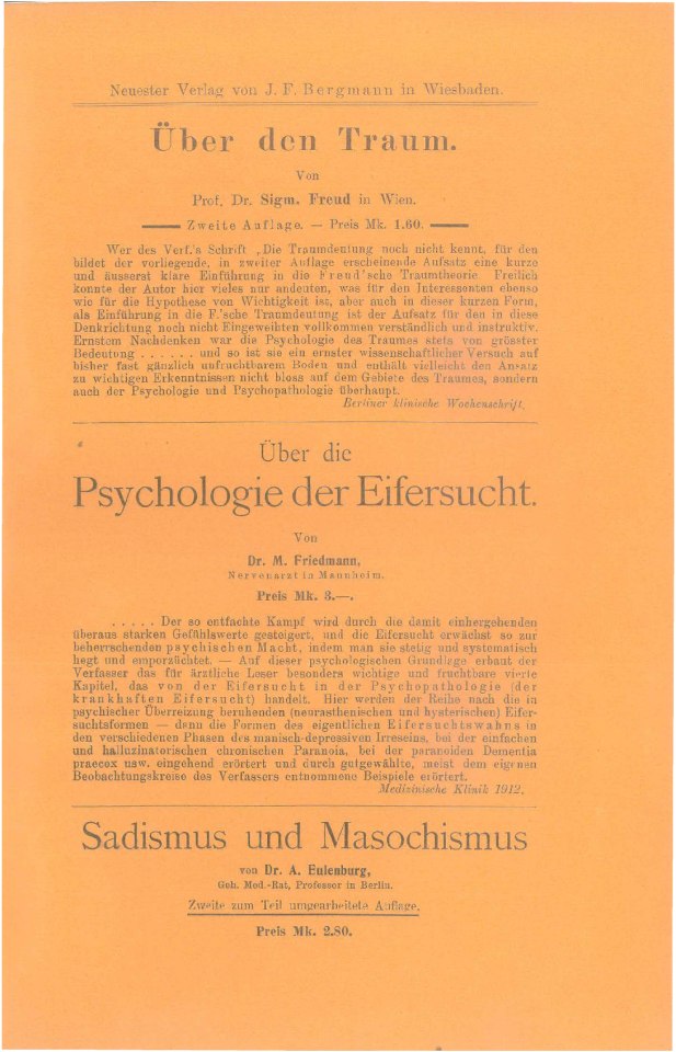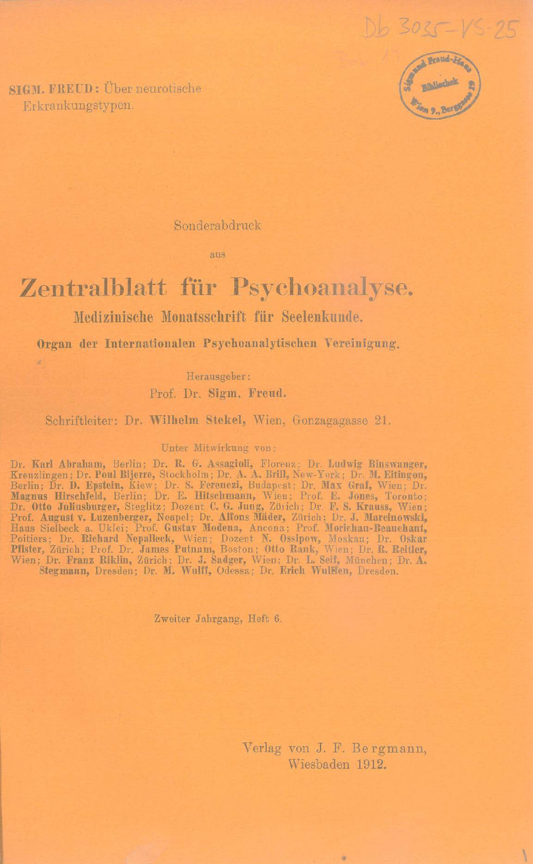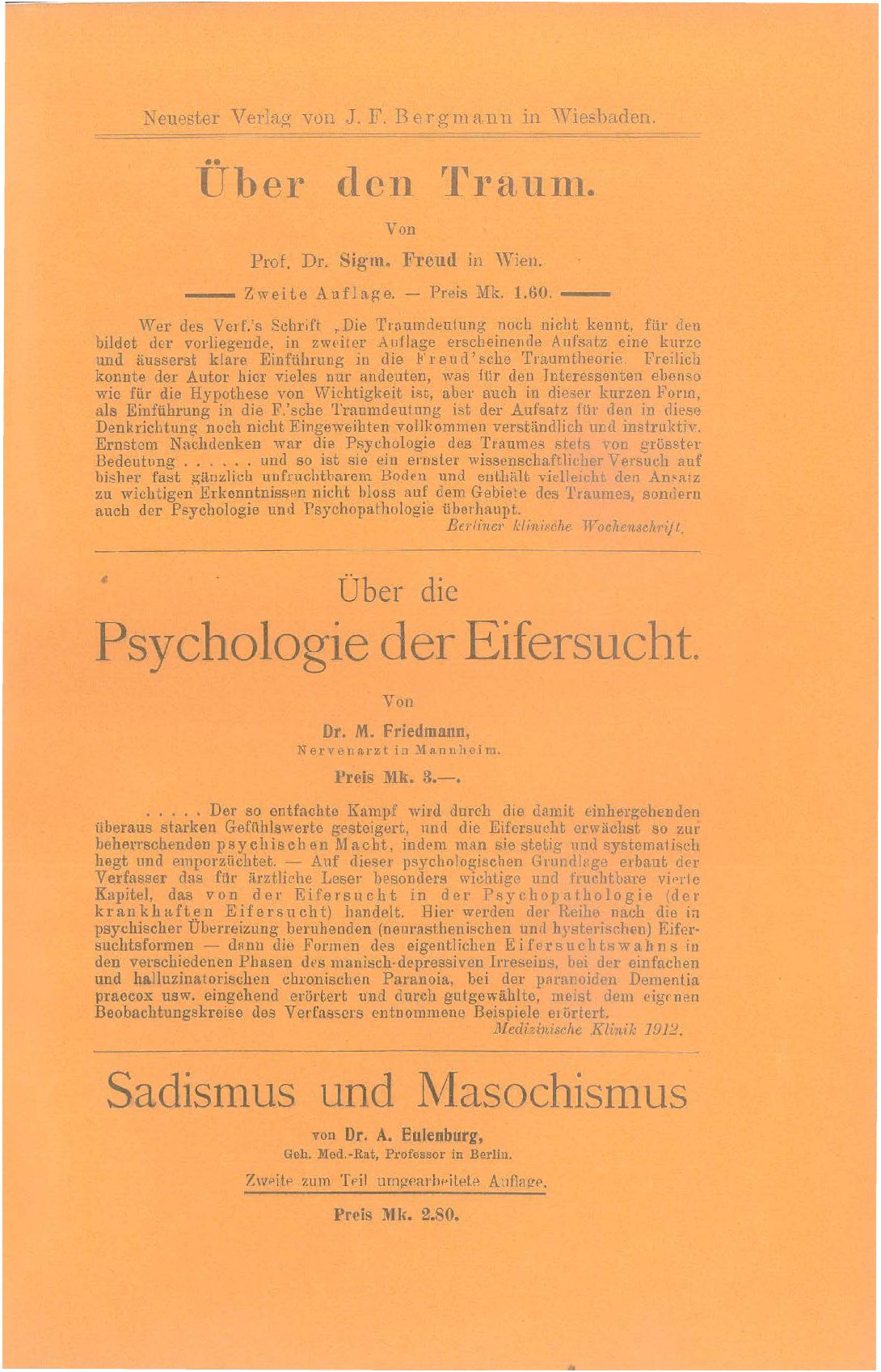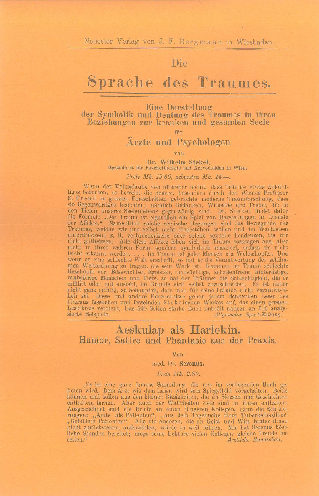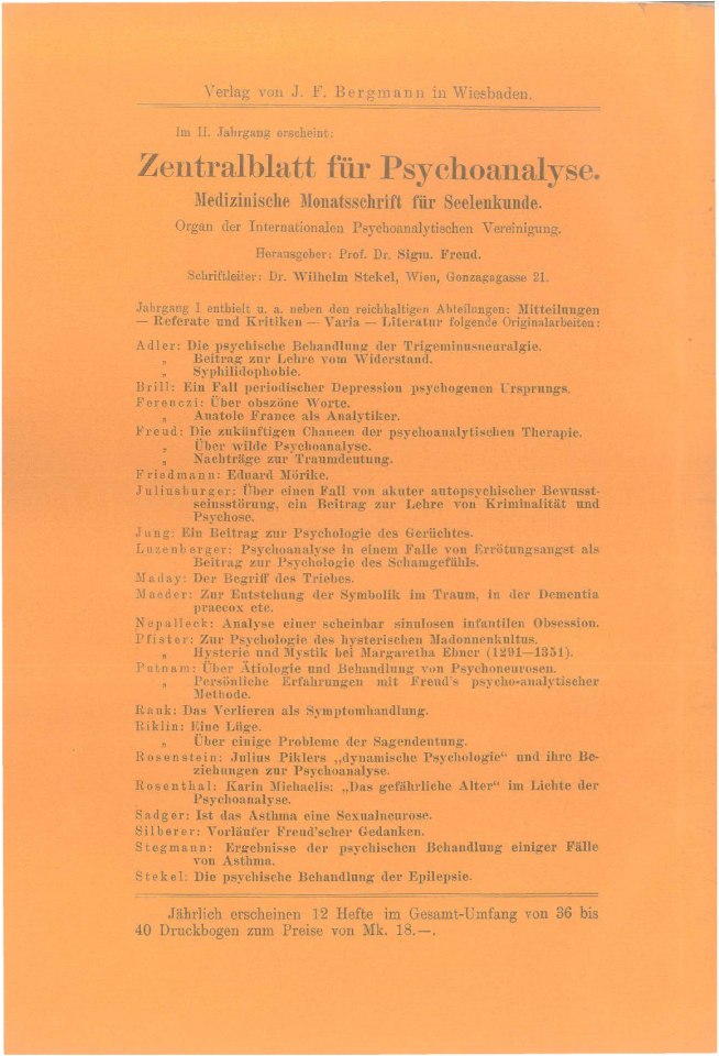 Schriftleiter: Dr. Wilhelm Stekel, Wien, Gonzagagasse 21.Jahrgang I enthielt u. a. neben den reichhaltigen Abteilungen: Mitteilungen