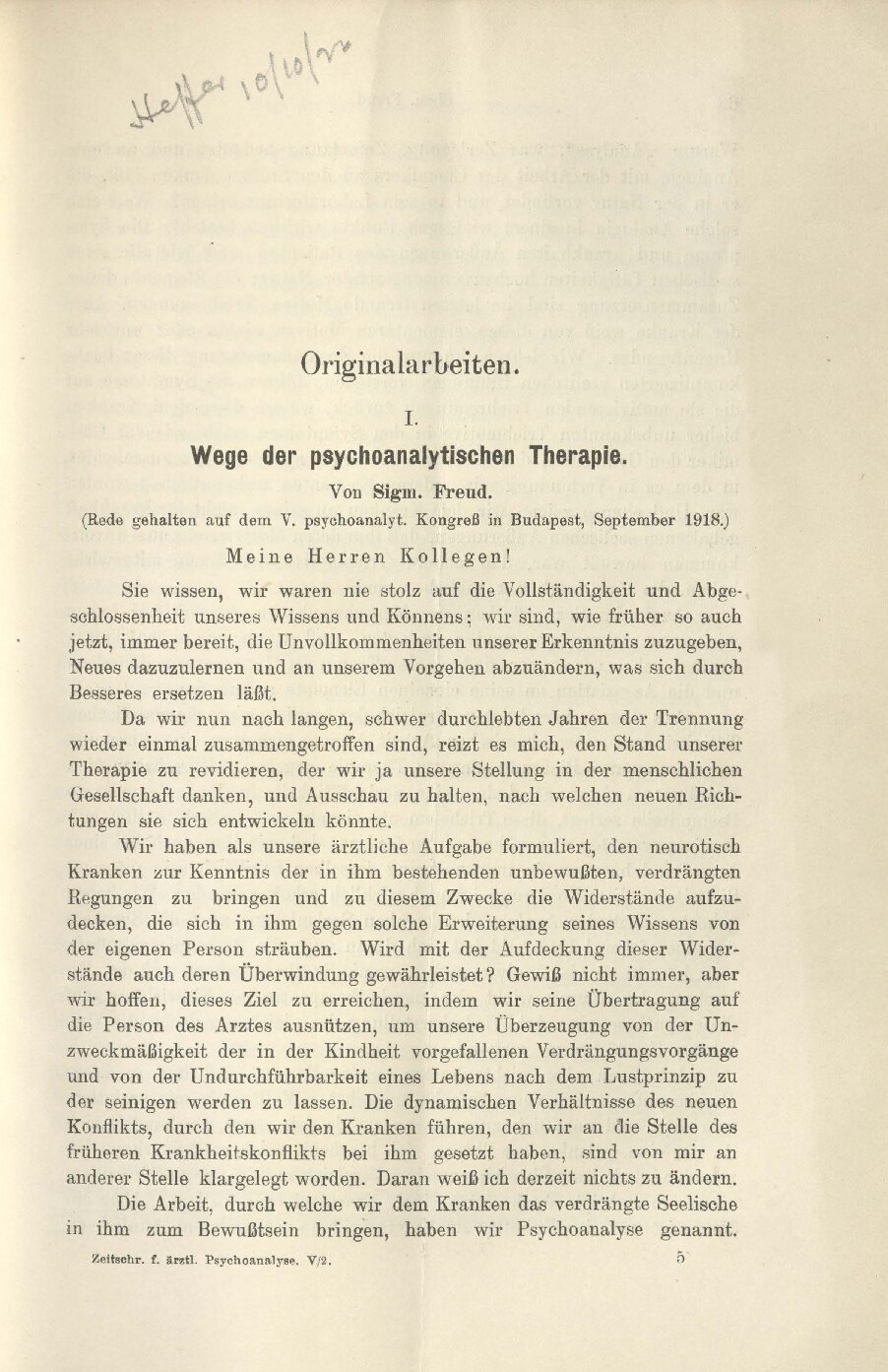 (Rede, gehalten am V. Psychoanalytischen Kongreß in Budapest, September 1918)