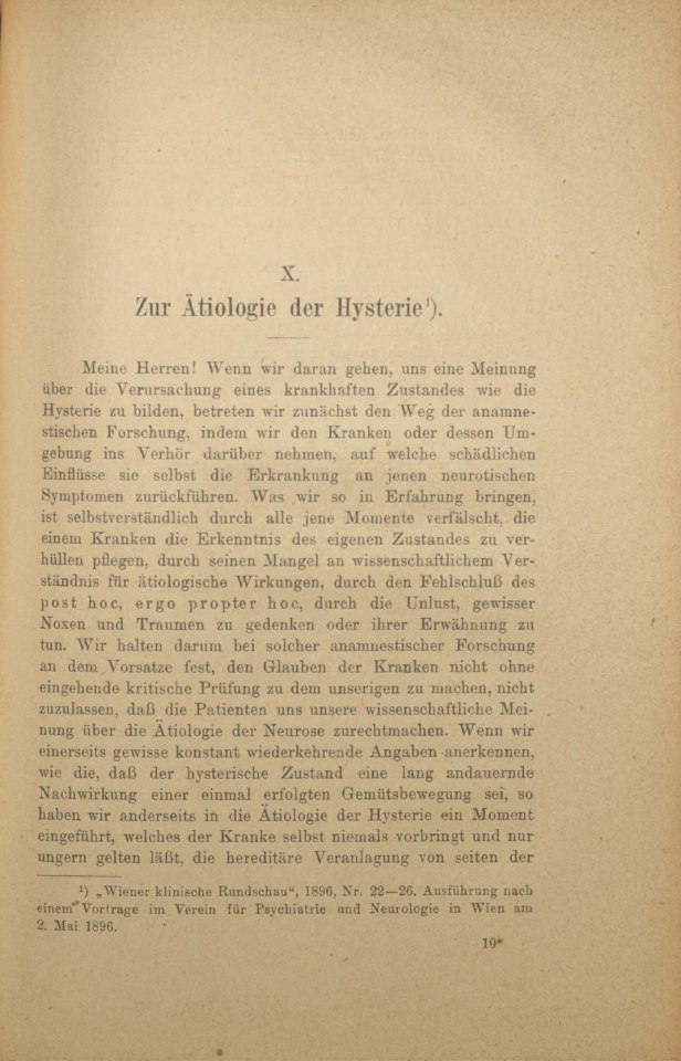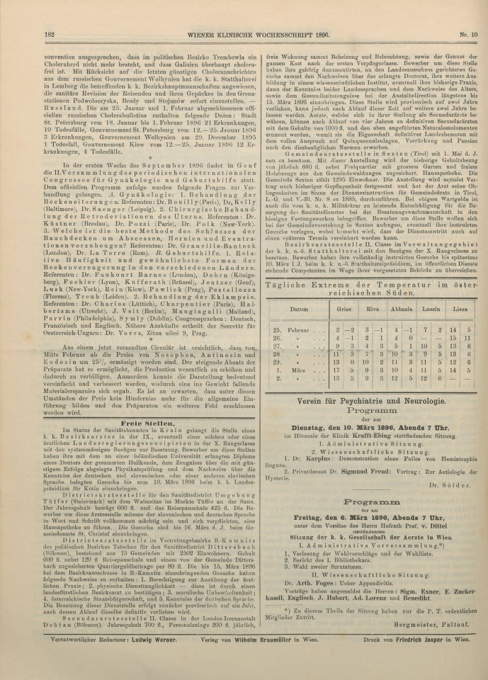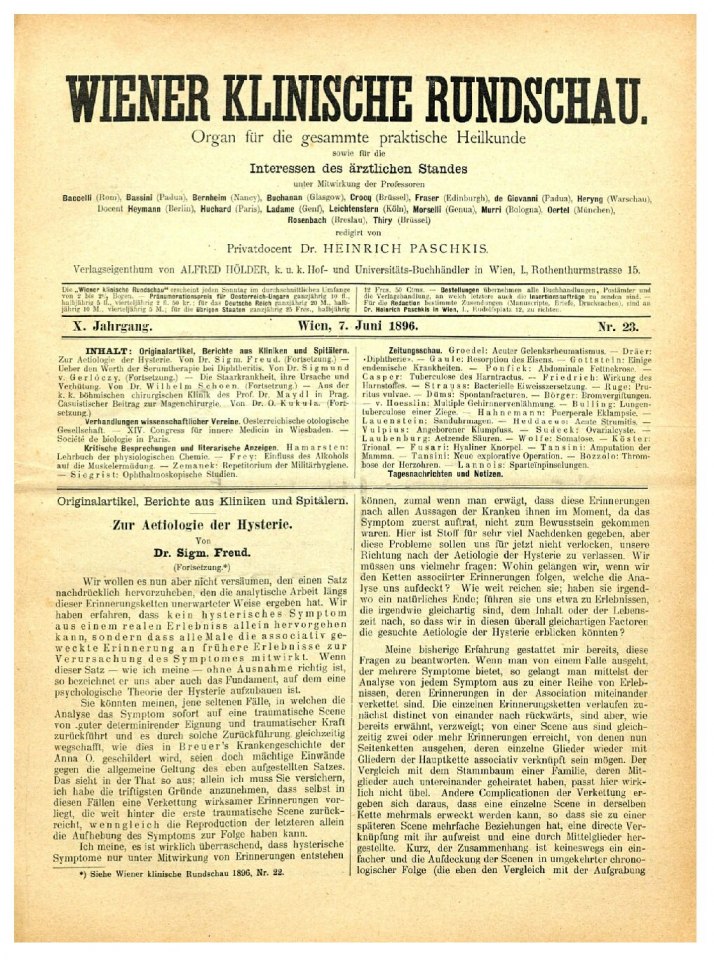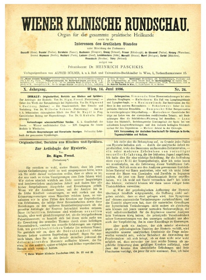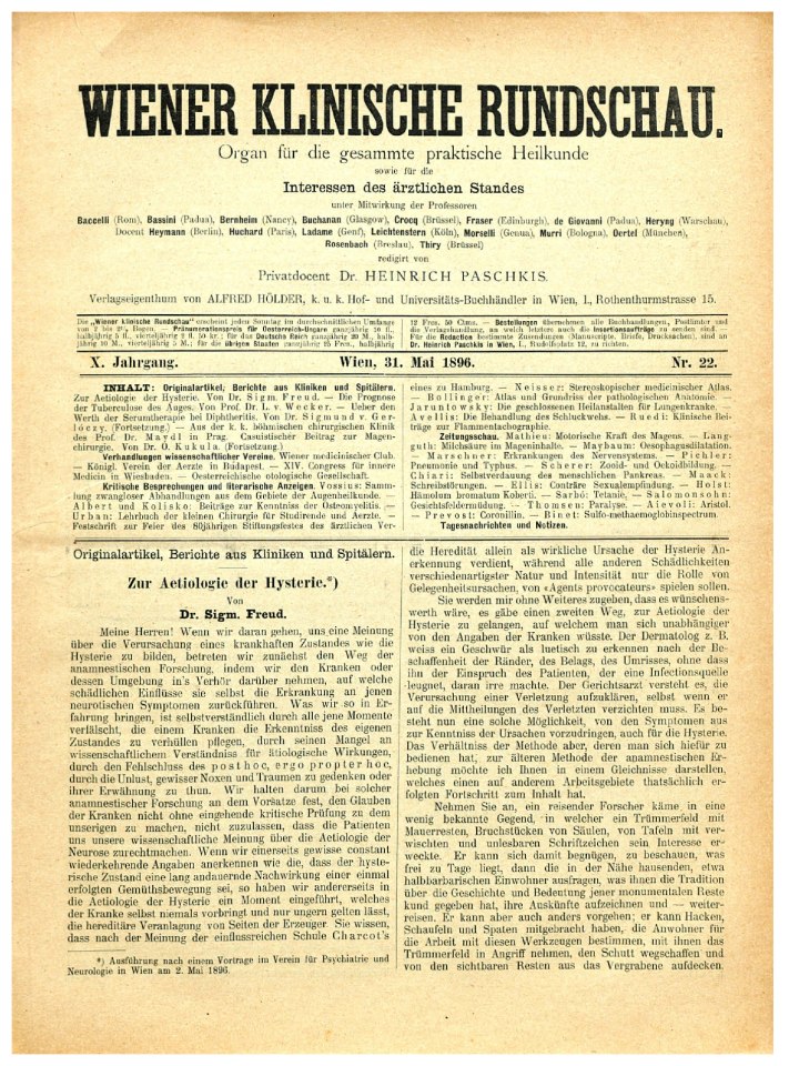 Freud, Sigmund | 1896-003/1896.01 | Zur Aetiologie der Hysterie [Vortragsankündigung] | Wiener Klinische Wochenschrift, 9, 1896, 10 | 182 | Fertig ✔ | Fertig ✔ | Ganz fertig / zutreffend ✔ | ✖ | ✖ | ✖ | ✔ | EB | ✔ | ||||