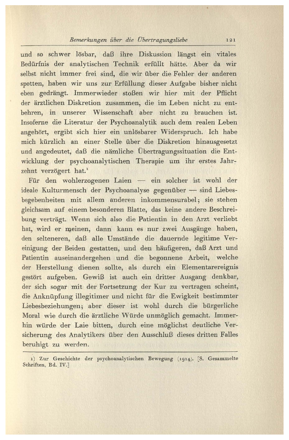 beruhigt zu werden.ı) Zur Geschichte der psychoanalytischen Bewegung (1914). [S. Gesammelte