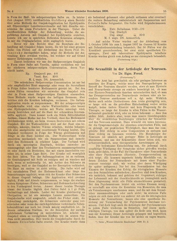 Freud, Sigmund | 1898-001/1898.2 | 1898a | 1898-01 | 10598 | Die Sexualität in der Aetiologie der Neurosen (Fortsetzung) | Wiener Klinische Rundschau, 12, 1898, 4 | 55–57 | Fertig ✔ | Fertig ✔ | Ganz fertig / zutreffend ✔ | Fehlt ✖ | Fehlt ✖ | Ganz fertig / zutreffend ✔ | ✔ | EB | ✔ | |