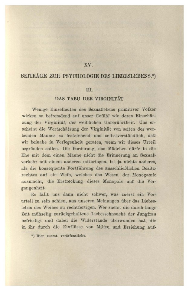 Freud, Sigmund (1918-003/1918): III. Das Tabu der Virginität. ›Sammlung kleiner Schriften zur Neurosenlehre‹, 4. Folge: SKSN 4, 1918:229-251. (zusammen mit dem Wiederabdruck den ersten beiden Beiträge).