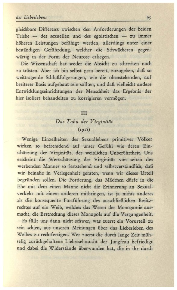 Freud, Sigmund | 1918-003/1924 | Das Tabu der Virginität | GS 5 | 212–231 | Fertig ✔ | Fertig ✔ | Ganz fertig / zutreffend ✔ | Fehlt ✖ | Fehlt ✖ | Ganz fertig / zutreffend ✔ | ✔ | EB | ✔ | ||||