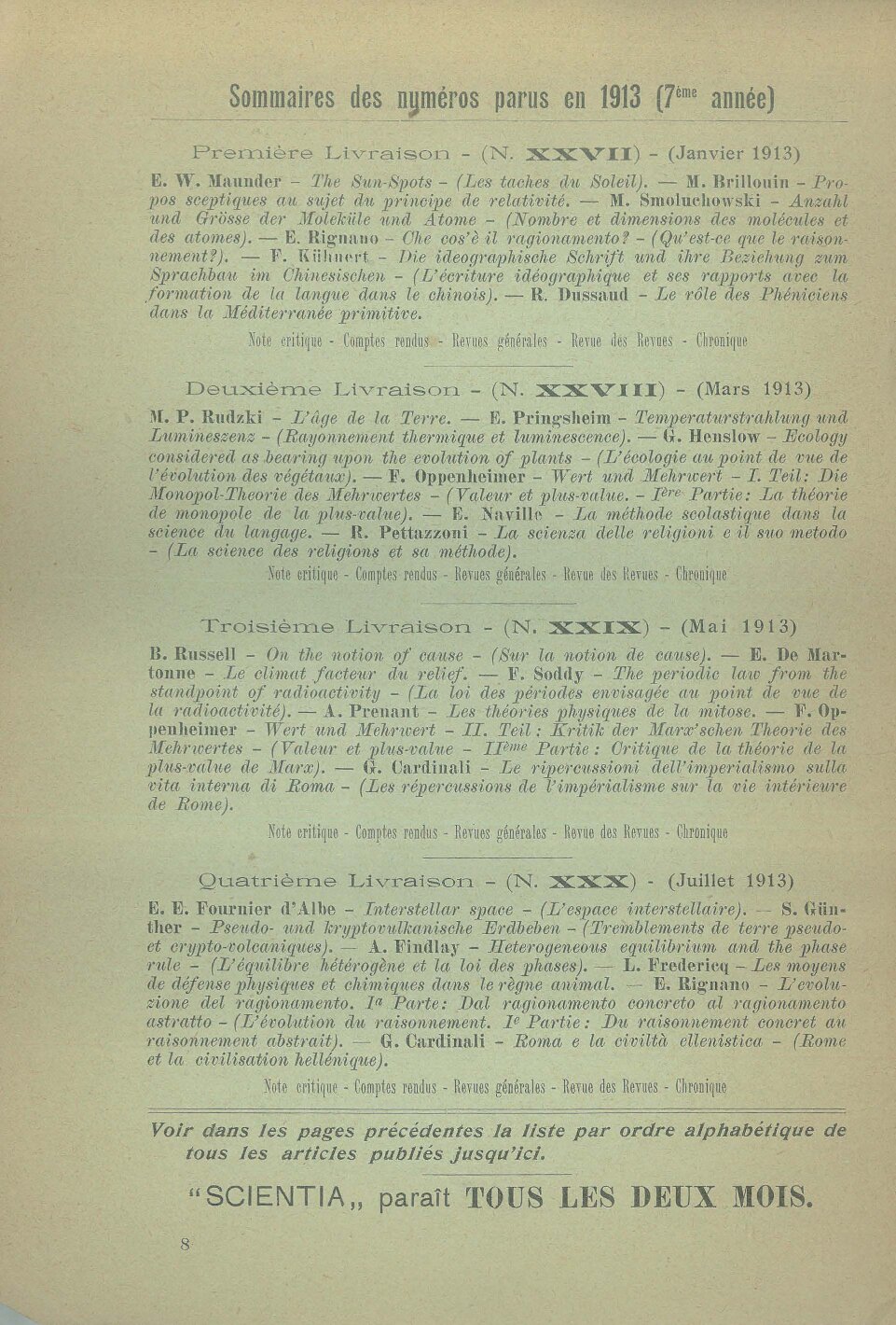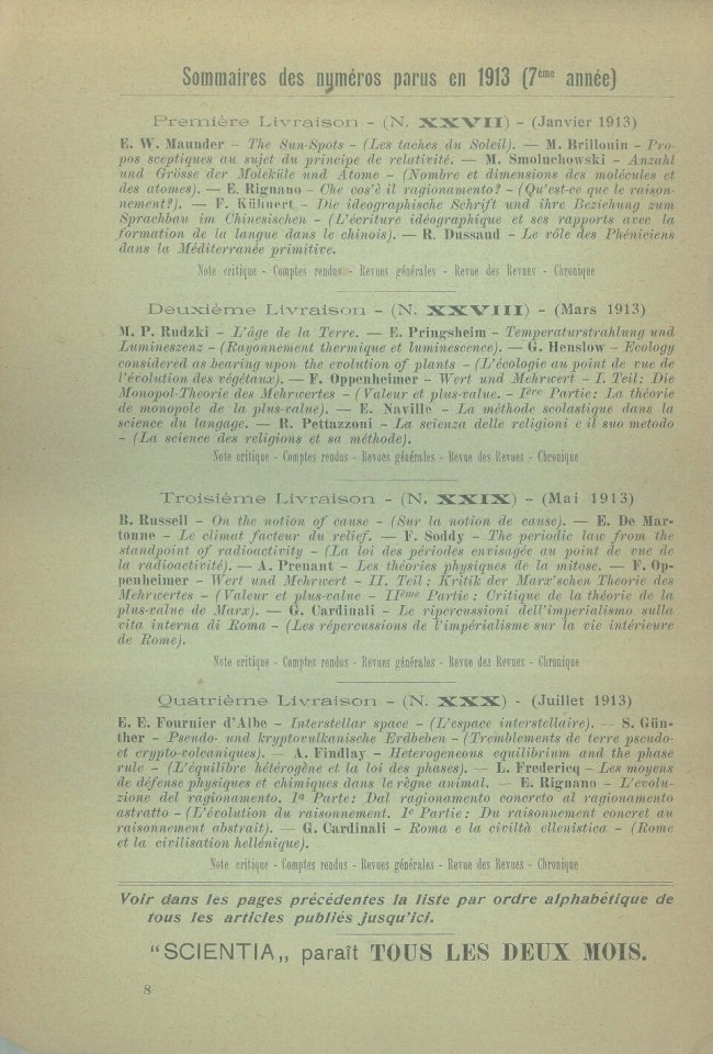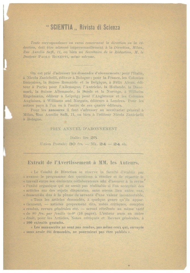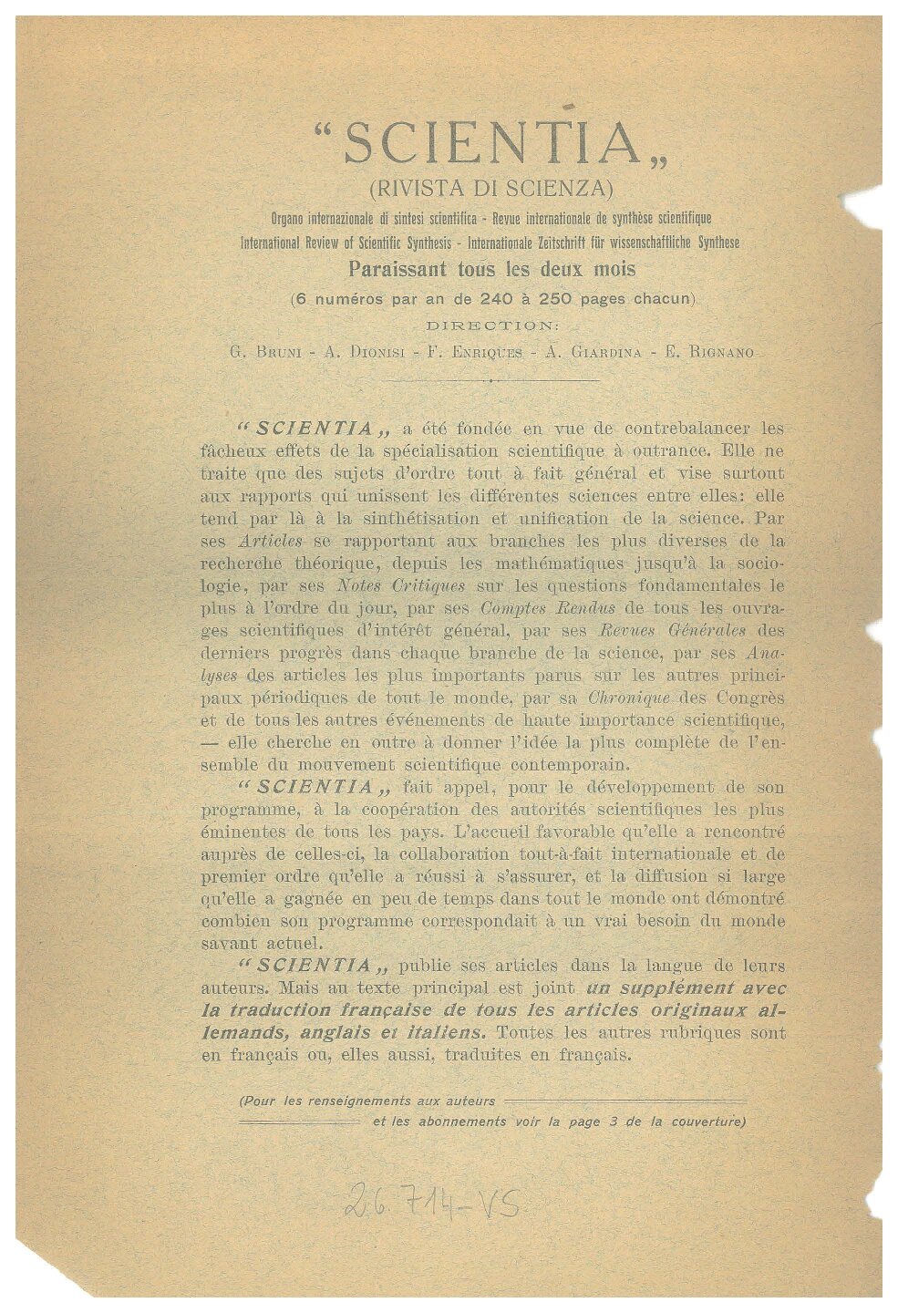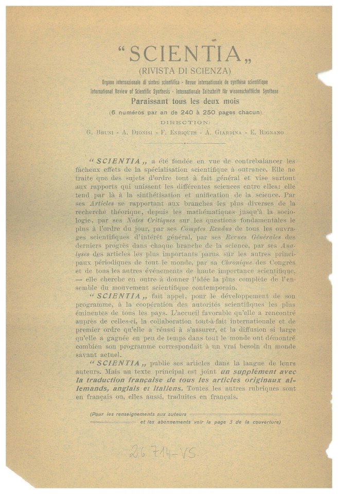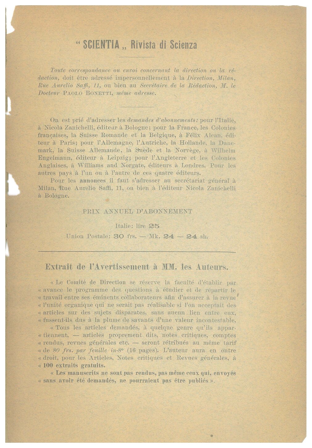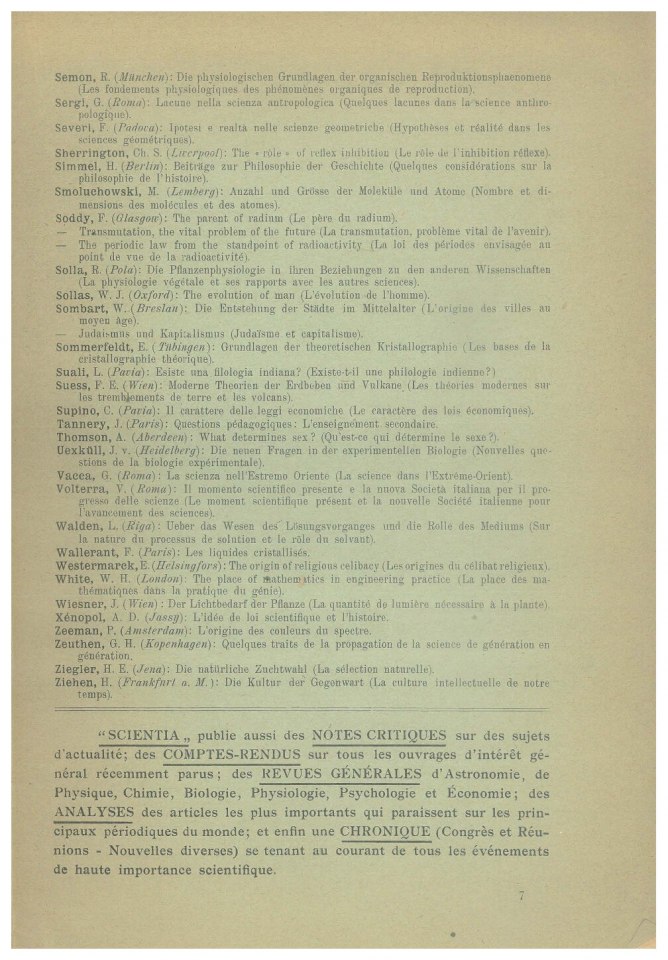"SCIENTIA,, a été fondée en vue de contrebalancer les fuchenx effets de la spécialisation scientifique a ontrance. Elle ne traite que des sujets d'ordre tout à fait général er vise surtout: ex rapports qui unissent les différentes sciences entre elles: elle tond par là à In sinthetisation et unification de la science. Par ses Articles se rapportant aux branches les plus diverses de la recherche théorique, depuis les mathématiques jusqu'à la socio logie, par ses Notes Critiques sur les questions fondamentales le plus à l'ordre du jour, par ses Comptes Rendus de tous les ouvra ges scientifiques l'intérêt général, par us Revues Générales des derniers progrès dans chaque branche de la science, par ses Ana lyse des articles les plus importants paris sur les antre princi paux périodiques de tout le monde, par an Chronique des Congrès et de tons les autres événements de haute importance scientifique, elle cherelie en ontre à donner l'idée la plus complète de l'en
