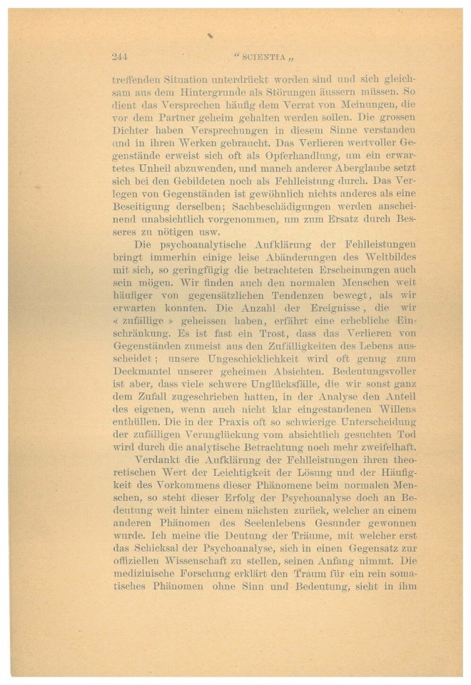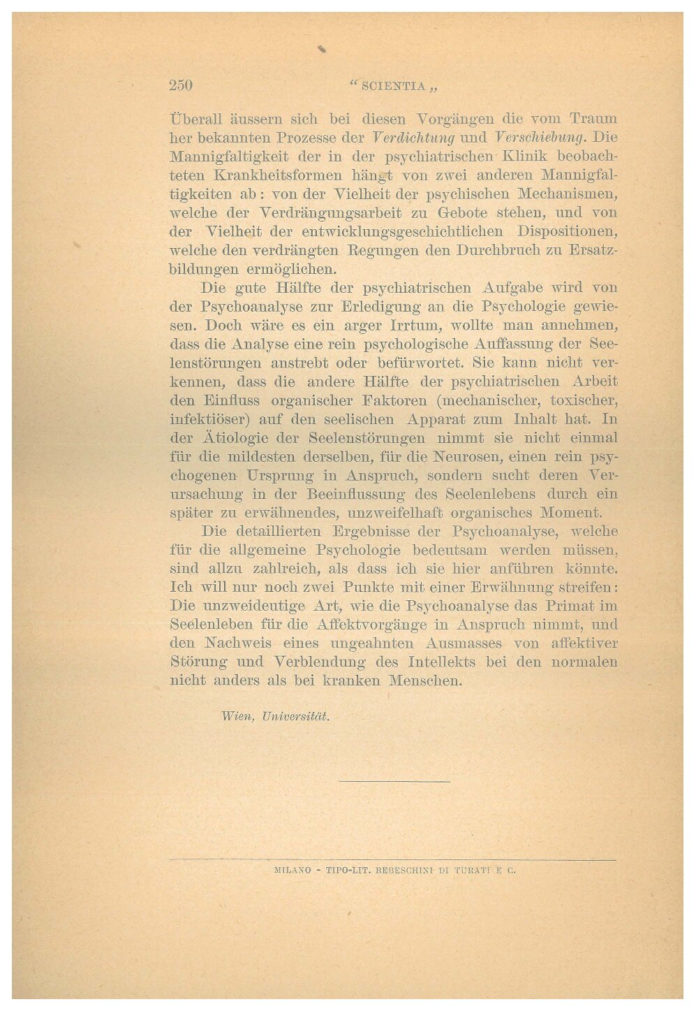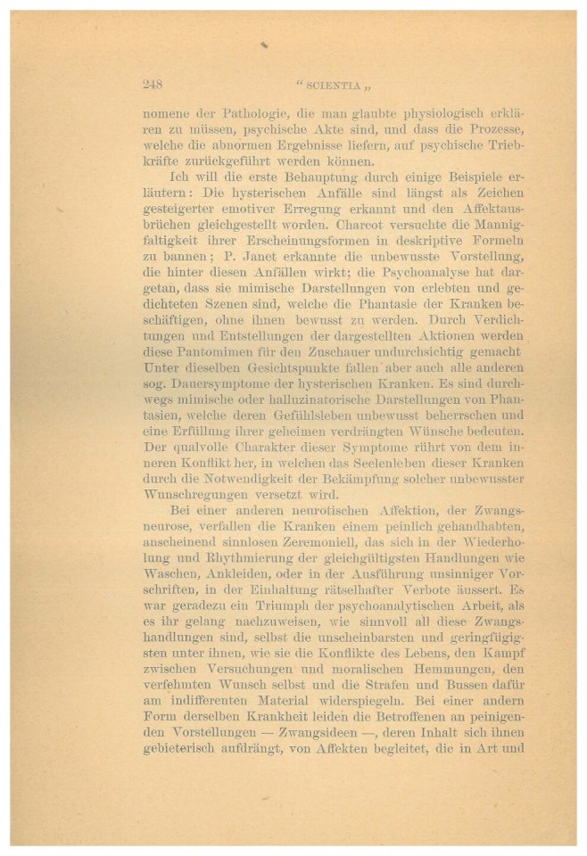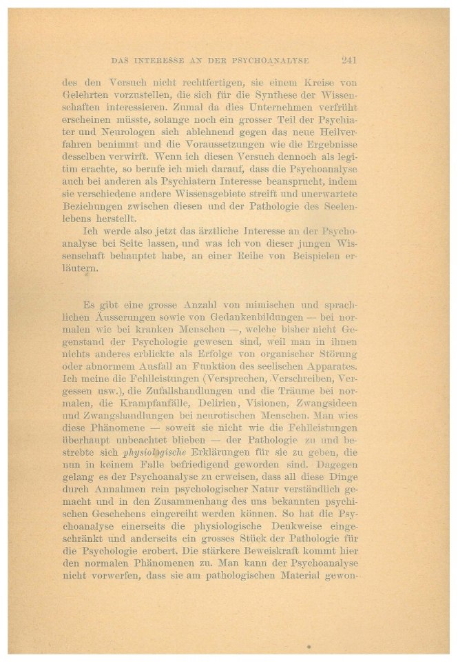 des den Versuch nicht rechtfertigen, sie einem Kreise von Gelehrten vorzustellen, die sich für die Synthese der Wissen schaften interessieren. Zumal da dies Unternehmen verfrüht erscheinen müsste, solange noch ein grosser Teil der Psychia ter and Neurologen sich ablehnend gegen das neue Heilver fahren benimmt und die Voraussetzungen wie die Ergebnisse desselben verwirft. Wenn ich diesen Versuch dennoch als legi tim erachte, so berufe ich mich darauf, dass die Psychoanalyse auch bei anderen als Psychiatern Interesse beansprucht, indem sie verschiedene andere Wissensgebiete streift und unerwartete Beziehungen zwischen diesen und der Pathologie des Seelen lebens herstellt.