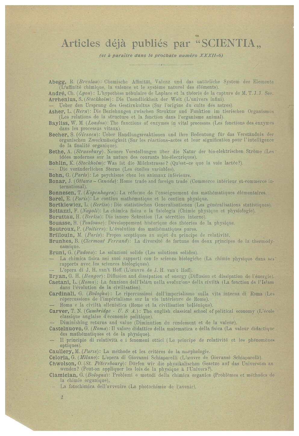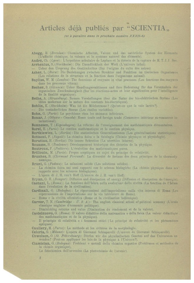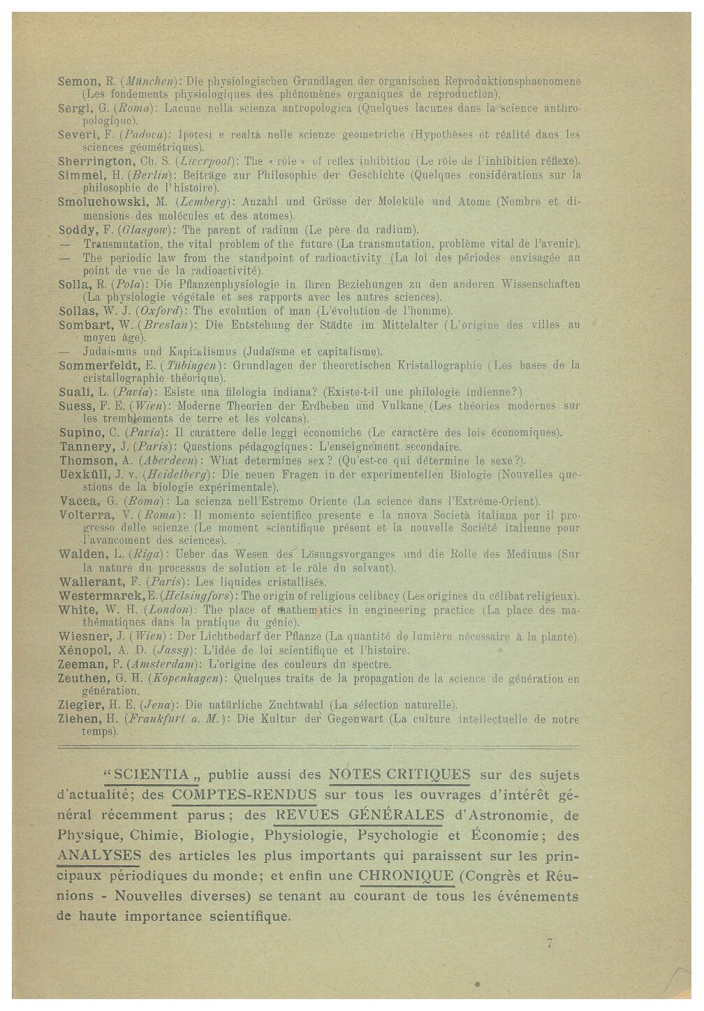 semble du mouvement scientifique contemporain. "SCIENTIA,, fait appel, pour le développement de som programme, à la coopération des autorités scientifiques les plus éminentes de tous les pays. L'accueil favorable qu'elle a rencontre auprès de celles-ci. In collaboration tout-à-fait internationale et de premier ordre qu'elle a réussi à s'assurer, et la diffusion si large qu'elle a gagnée en pen de temps dans tout le monde ont démontre combien son programme correspondait à un vrai besoin du monde savant actuel.