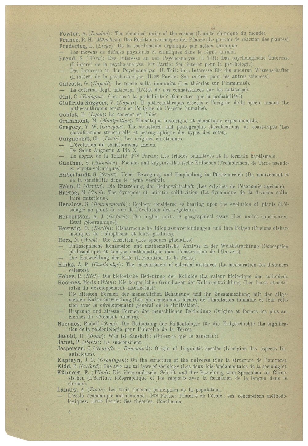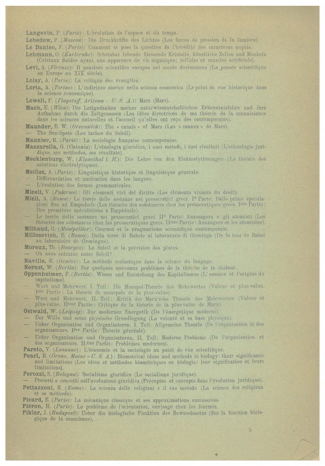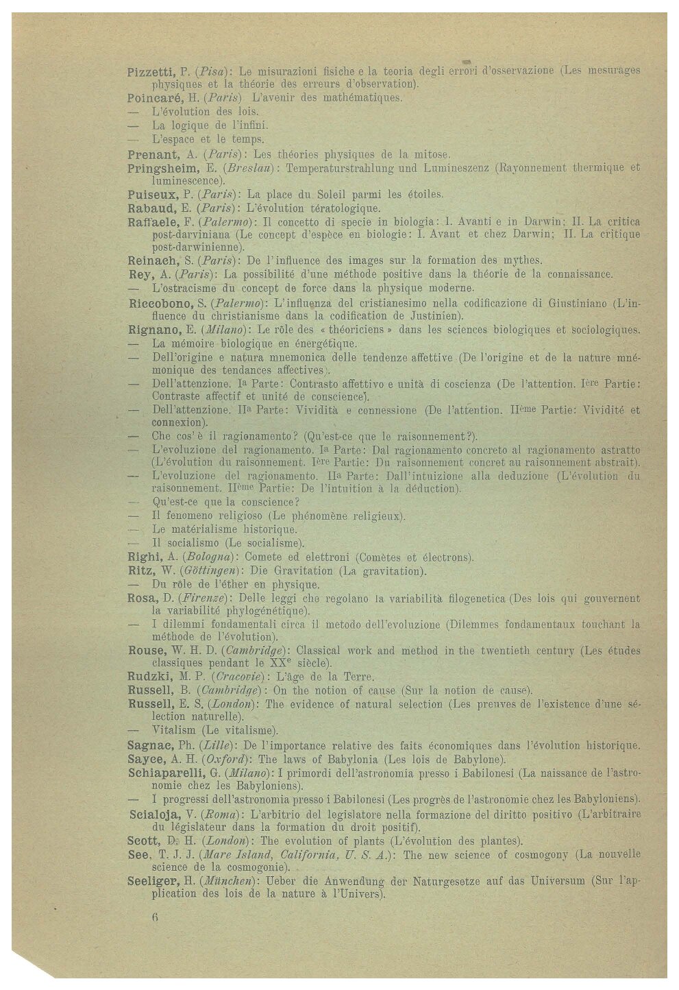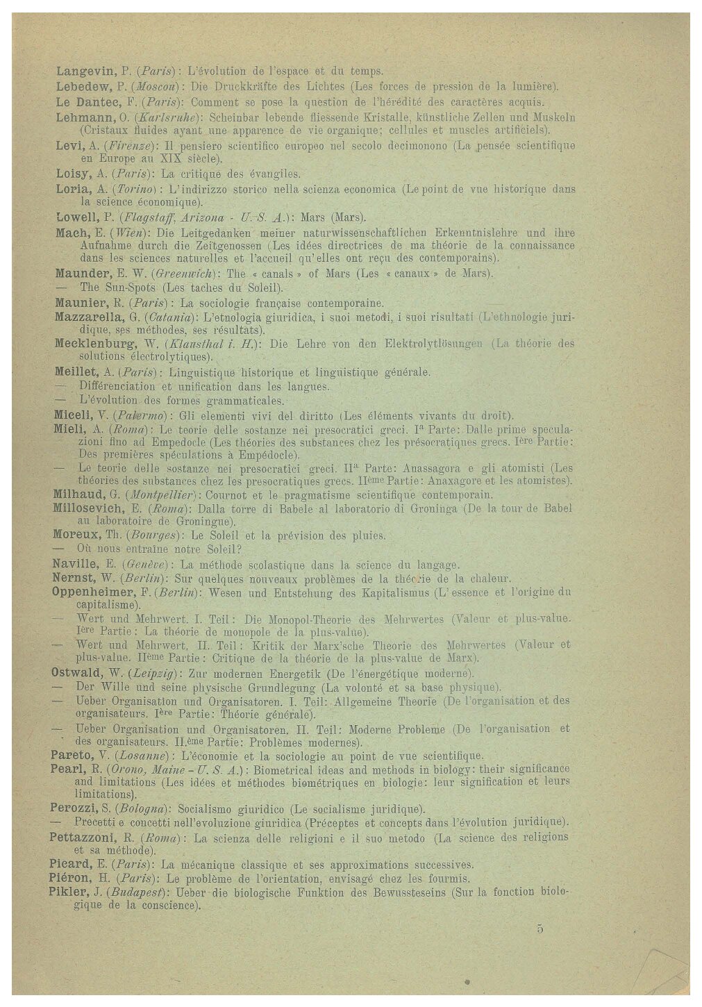 semble du mouvement scientifique contemporain. "SCIENTIA,, fait appel, pour le développement de som programme, à la coopération des autorités scientifiques les plus éminentes de tous les pays. L'accueil favorable qu'elle a rencontre auprès de celles-ci. In collaboration tout-à-fait internationale et de premier ordre qu'elle a réussi à s'assurer, et la diffusion si large qu'elle a gagnée en pen de temps dans tout le monde ont démontre combien son programme correspondait à un vrai besoin du monde savant actuel.