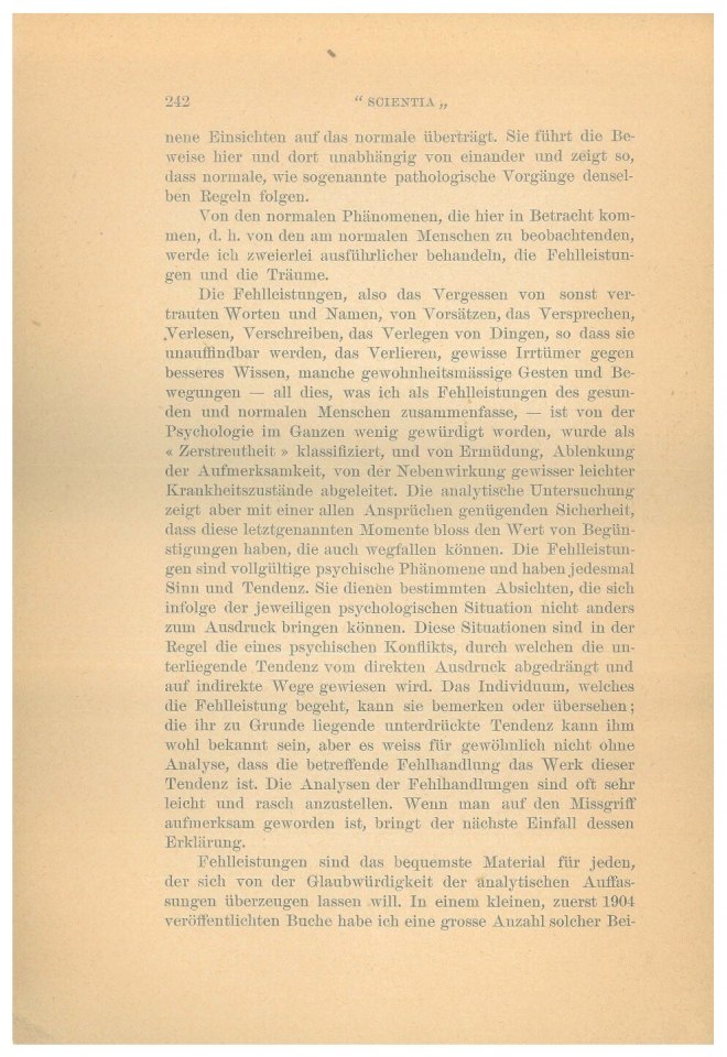 Es gibt eine grosse Anzahl von mimischen und sprach lichen Ausserungen sowie von Gedankenbildungen bei nor malen wie bei kranken Menschen, welche bisher nicht Ge genstand der Psychologie gewesen sind, weil man in ihnen nichts anderes erblickte als Erfolge von organischer Störung oder abnormem Ausfall an Funktion des seelischen Apparates. Ich meine die Fehlleistungen (Versprechen, Verschreiben, Ver gessen usw.), die Zufallshandlungen und die Träume bei nor malen, die Krampfanfälle, Delirien, Visionen, Zwangsideen nud Zwangshandlungen bei neurotischen Menschen. Man wies diese Phlinomene soweit sie nicht wie die Fehlleistungen - berhaupt unbeachtet blieben der Pathologie zu und be strebte sich physiologische Erklärungen für sie zu geben, die un in keinem Falle befriedigend geworden sind. Dagegen gelang es der Psychoanalyse zu erweisen, dass all diese Dinge durch Annalumnen rein psychologischer Natur verständlich ge macht und in den Zusammenhang des uns bekannten psychi schen Geschehens eingereiht werden können. So hat die Psy choanalyse einerseits die physiologische Denkweise einge schränkt und anderseits ein grosses Stück der Pathologie für die Psychologie erobert. Die stärkere Beweiskraft kommt hier den normalen Phänomenen zu. Man kann der Psychoanalyse nicht vorwerfen, dass sie am pathologischen Material gewon