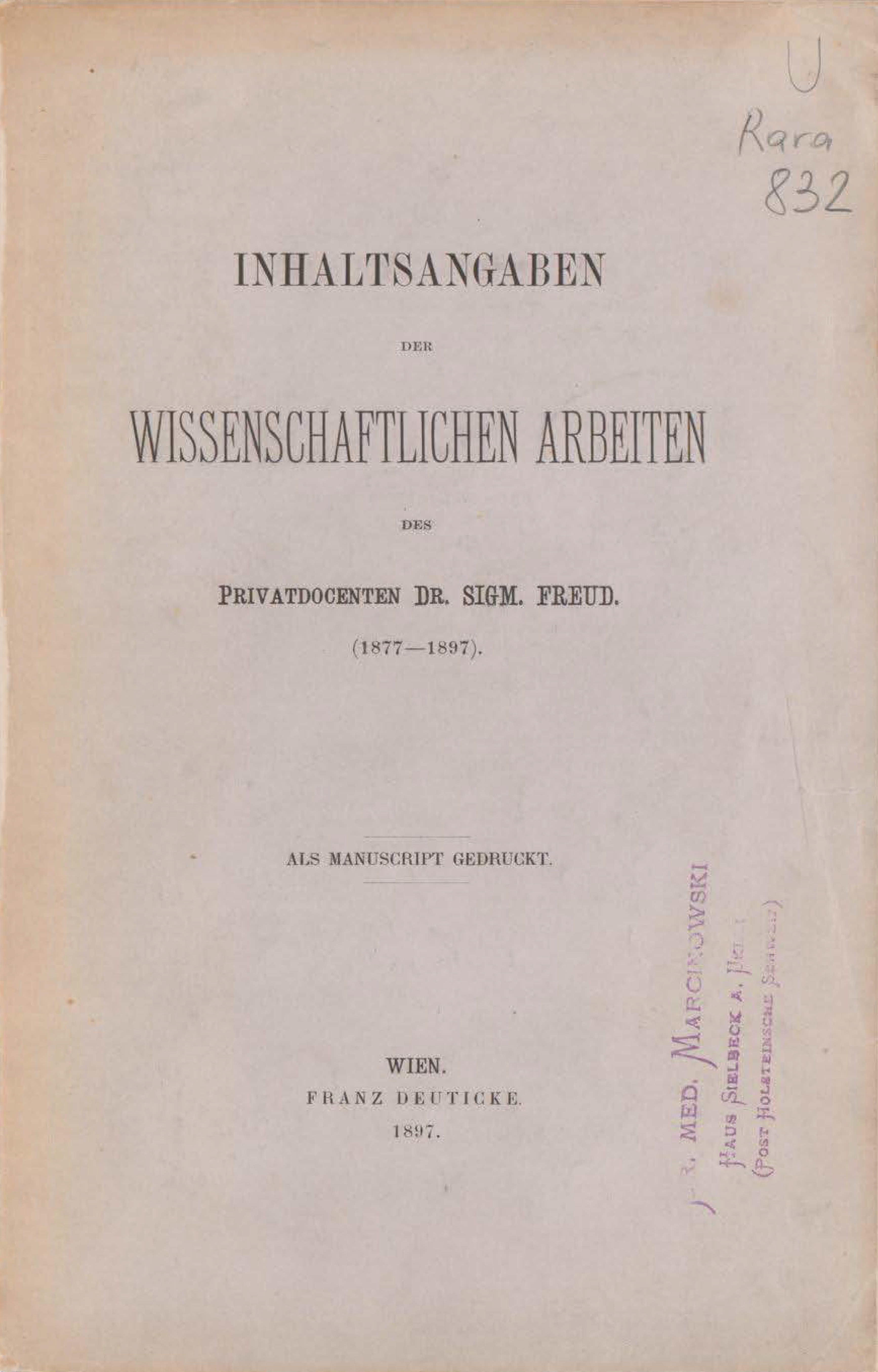 Freud, Sigmund: Inhaltsangaben der wissenschaftlichen Arbeiten des Privatdocenten Dr. Sigm. Freud. (1877-1897). 1897