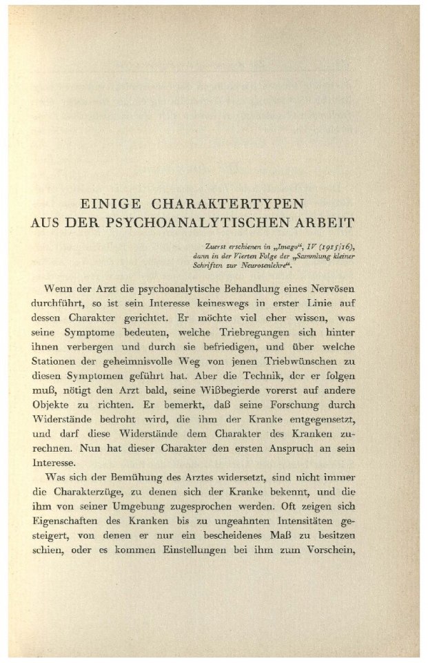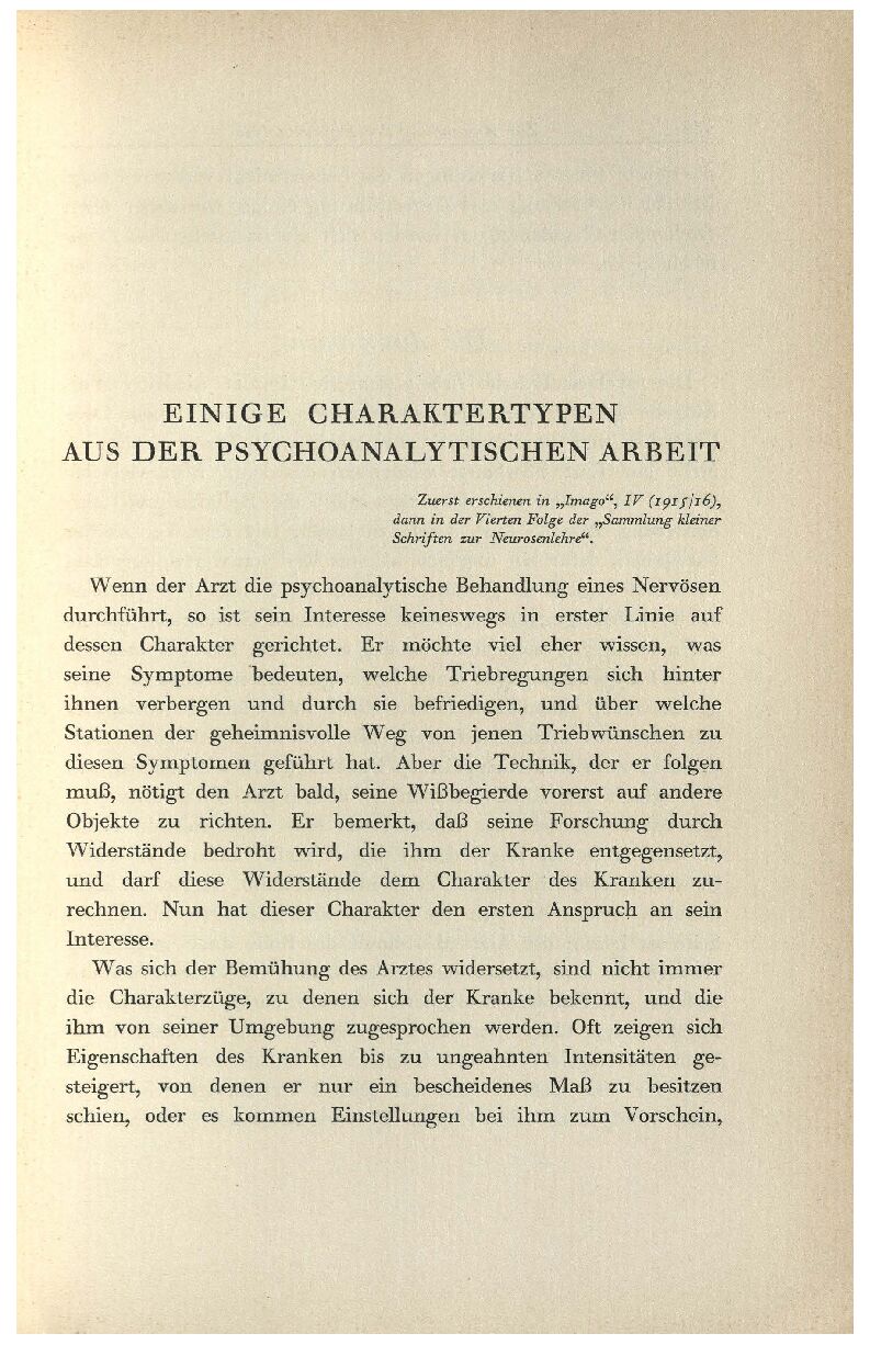 Schriften zur Neurosenlehre".Wenn der Arzt die psychoanalytische Behandlung eines Nervösen durchführt, so ist sein Interesse keineswegs in erster Linie auf dessen Charakter gerichtet. Er möchte viel eher wissen, was seine Symptome bedeuten, welche Triebregungen sich hinter ihnen verbergen und durch sie befriedigen, und über welche Stationen der geheimnisvolle Weg von jenen Triebwünschen zu diesen Symptomen geführt hat. Aber die Technik, der er folgen muß, nötigt den Arzt bald, seine Wißbegierde vorerst auf andere Objekte zu richten. Er bemerkt, daß seine Forschung durch Widerstände bedroht wird, die ihm der Kranke entgegensetzt, und darf diese Widerstände dem Charakter des Kranken zurechnen. Nun hat dieser Charakter den ersten Anspruch an sein Interesse.