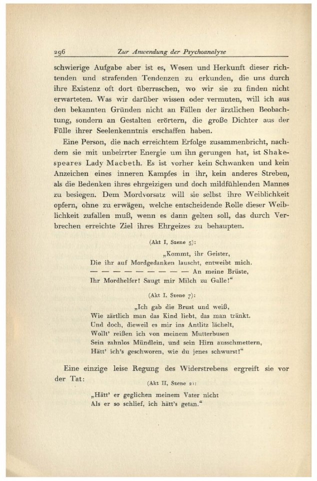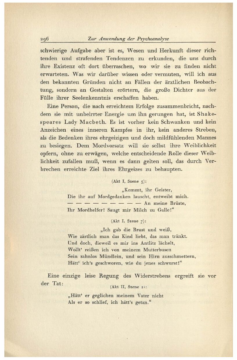 schwierige Aufgabe aber ist es, Wesen und Herkunft dieser richtenden und strafenden Tendenzen zu erkunden, die uns durch ihre Existenz oft dort überraschen, wo wir sie zu finden nicht erwarteten. Was wir darüber wissen oder vermuten, will ich aus den bekannten Gründen nicht an Fällen der ärztlichen Beobachtung, sondern an Gestalten erörtern, die große Dichter aus der Fülle ihrer Seelenkenntnis erschaffen haben.