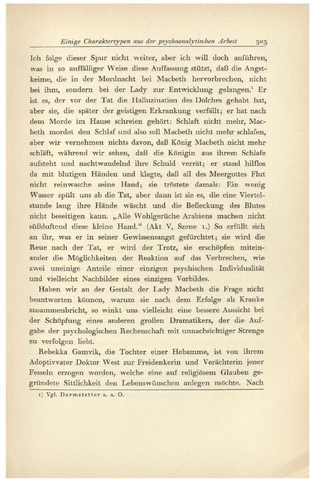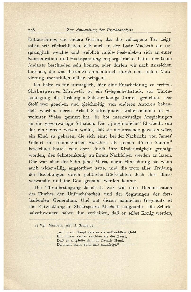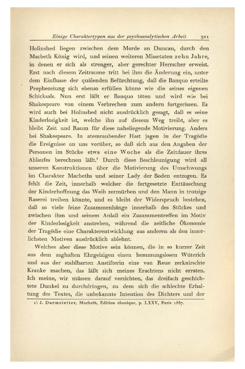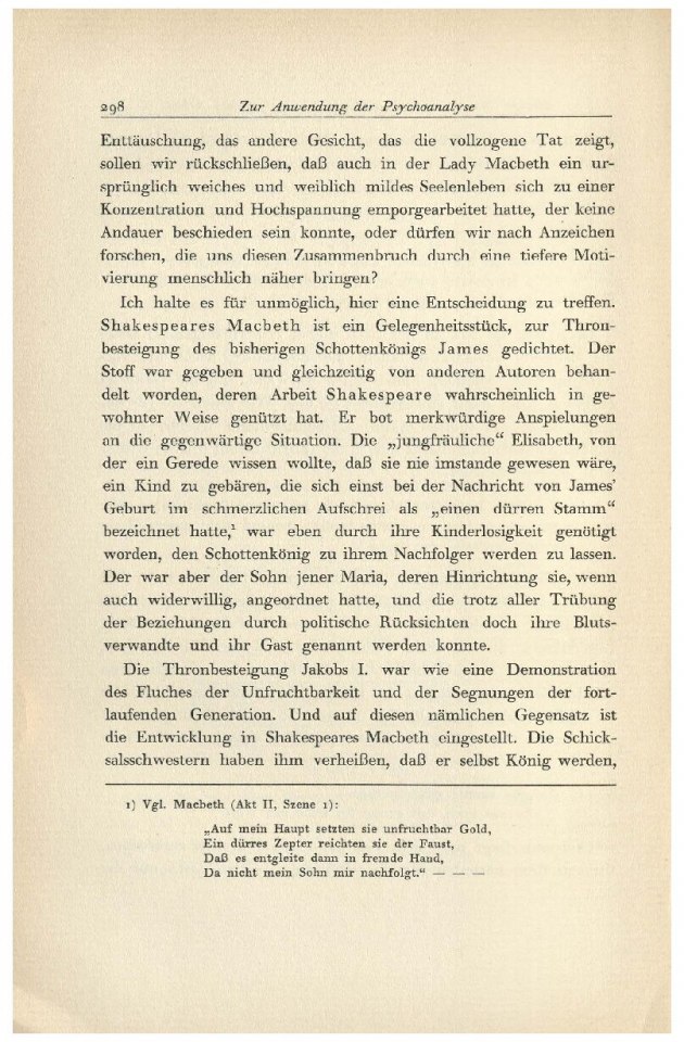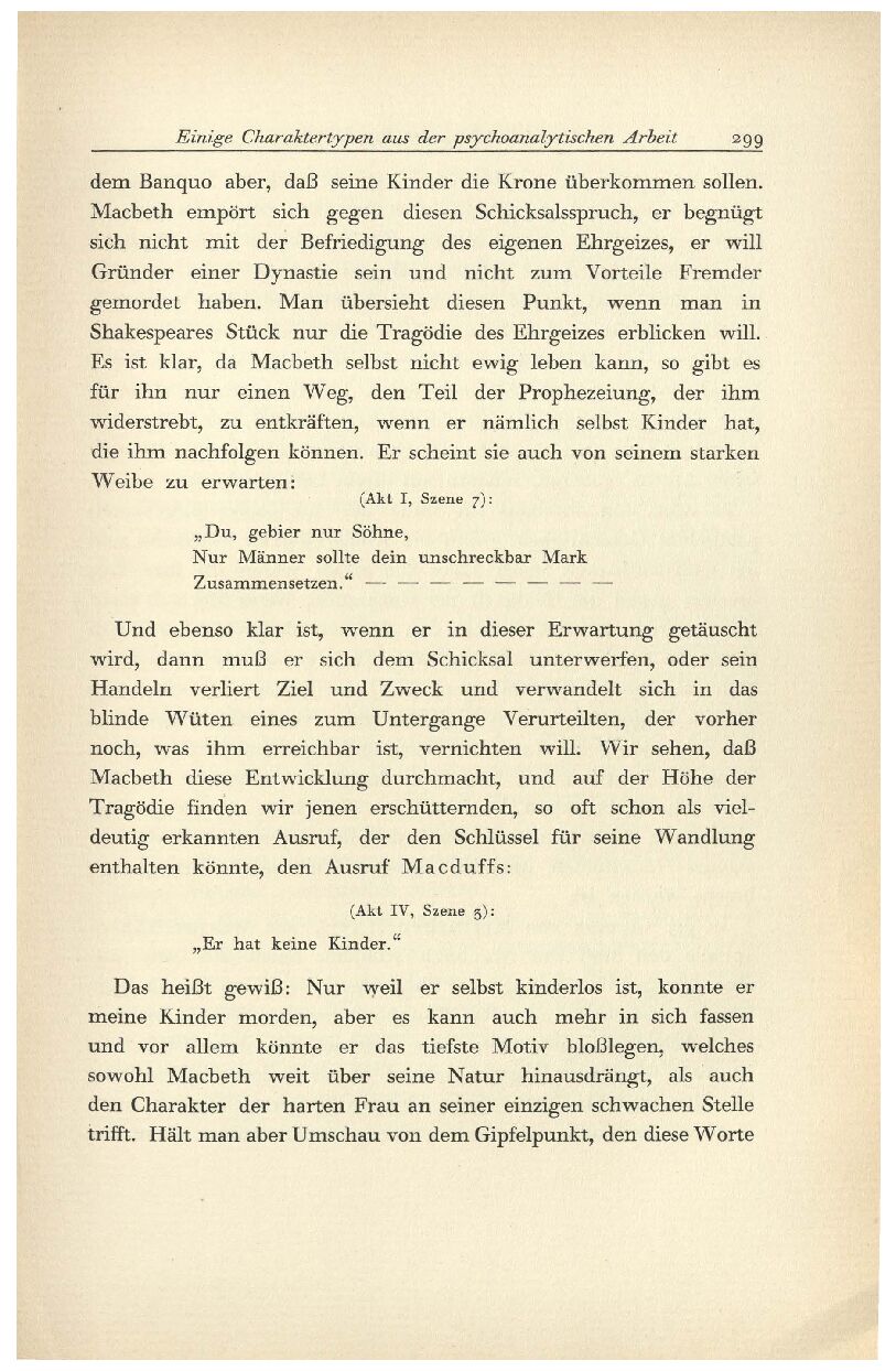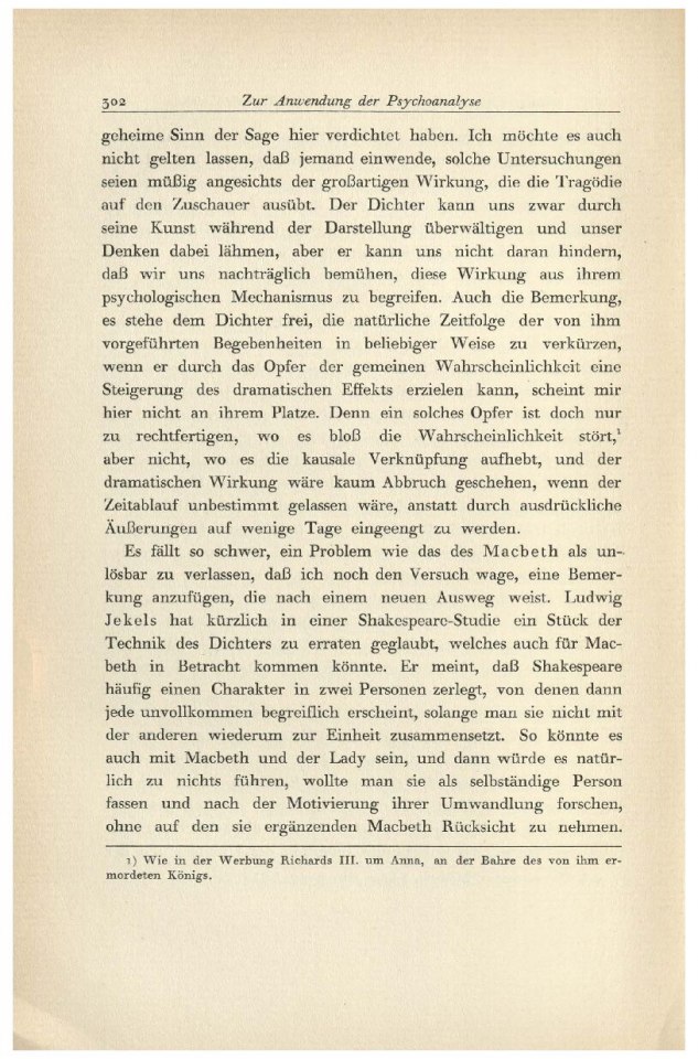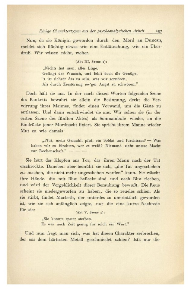 Es fällt so schwer, ein Problem wie das des Macbeth als unlösbar zu verlassen, daß ich noch den Versuch wage, eine Bemerkung anzufügen, die nach einem neuen Ausweg weist. Ludwig Jekels hat kürzlich in einer Shakespeare-Studie ein Stück der Technik des Dichters zu erraten geglaubt, welches auch für Macbeth in Betracht kommen könnte. Er meint, daß Shakespeare häufig einen Charakter in zwei Personen zerlegt, von denen dann jede unvollkommen begreiflich erscheint, solange man sie nicht mit der anderen wiederum zur Einheit zusammensetzt. So könnte es auch mit Macbeth und der Lady sein, und dann würde es natürlich zu nichts führen, wollte man sie als selbständige Person fassen und nach der Motivierung ihrer Umwandlung forschen, ohne auf den sie ergänzenden Macbeth Rücksicht zu nehmen.