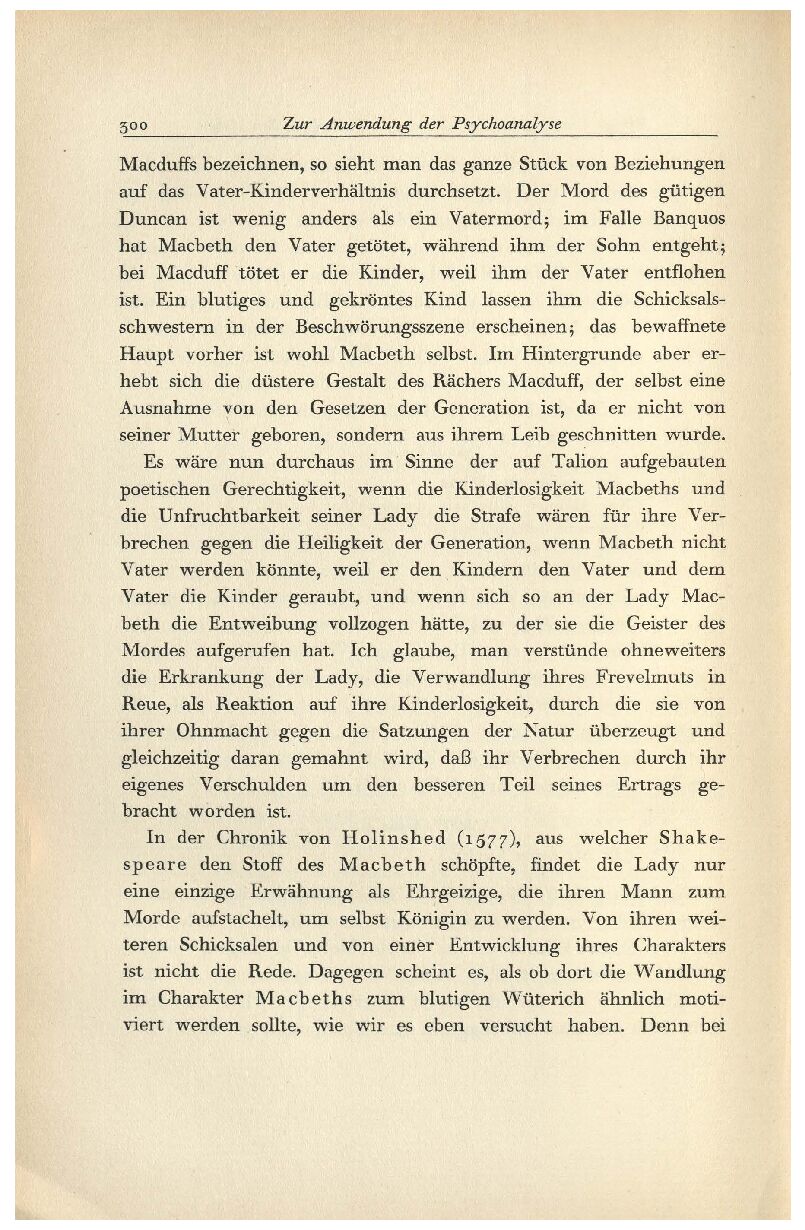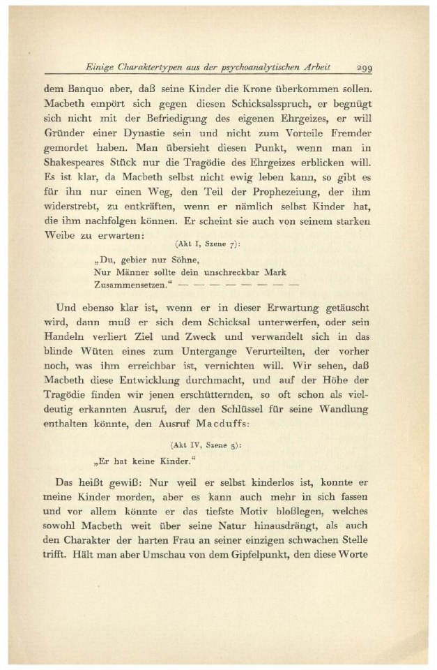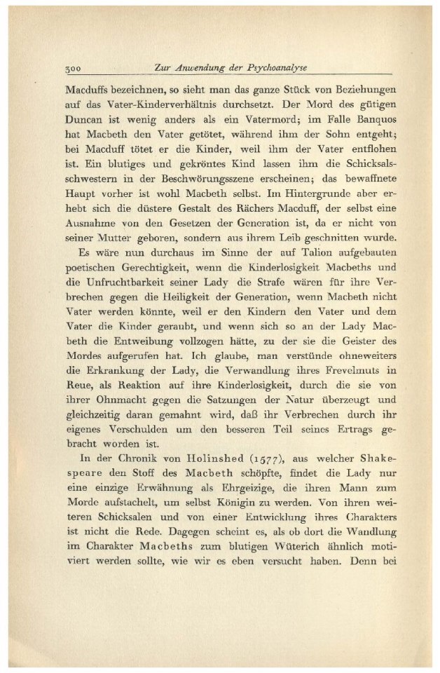 Macduffs bezeichnen, so sieht man das ganze Stück von Beziehungen auf das Vater-Kinderverhältnis durchsetzt. Der Mord des gütigen Duncan ist wenig anders als ein Vatermord; im Falle Banquos hat Macbeth den Vater getötet, während ihm der Sohn entgeht; bei Macduff tötet er die Kinder, weil ihm der Vater entflohen ist. Ein blutiges und gekröntes Kind lassen ihm die Schicksalsschwestern in der Beschwörungsszene erscheinen; das bewaffnete Haupt vorher ist wohl Macbeth selbst. Im Hintergrunde aber erhebt sich die düstere Gestalt des Rächers Macduff, der selbst eine Ausnahme von den Gesetzen der Generation ist, da er nicht von seiner Mutter geboren, sondern aus ihrem Leib geschnitten wurde.