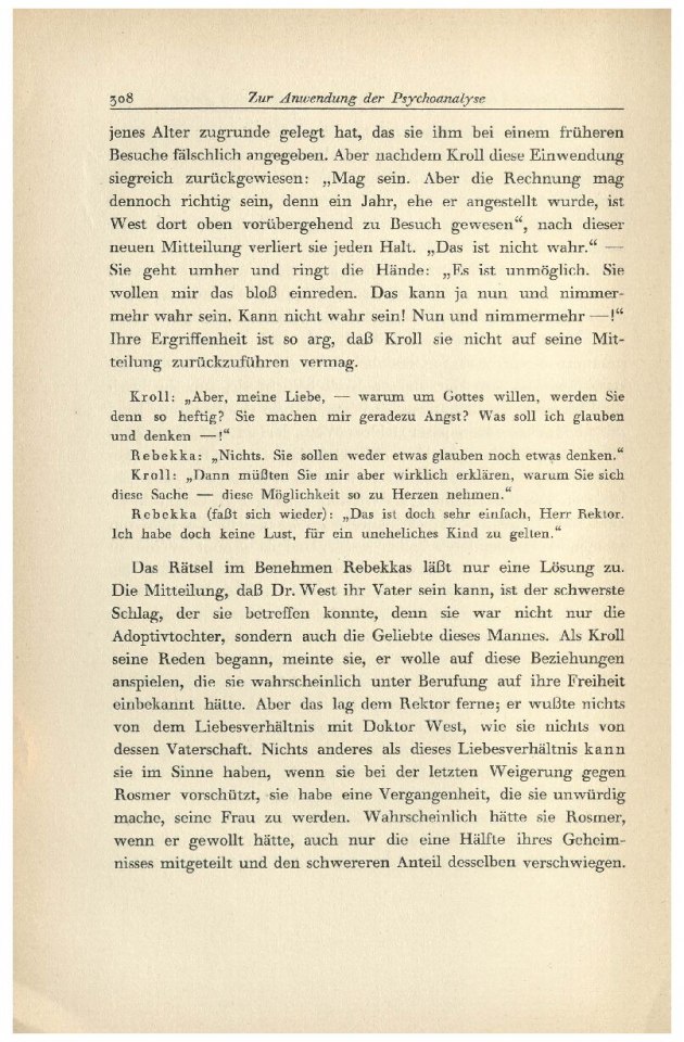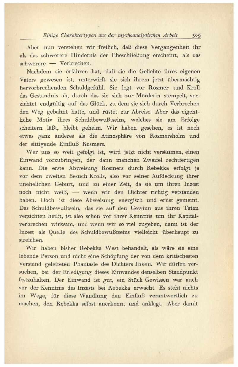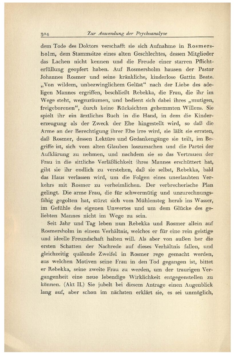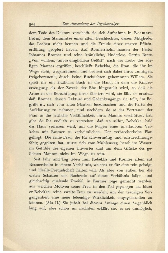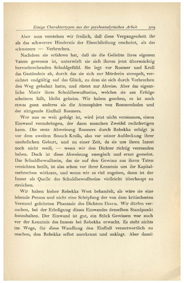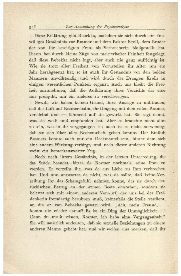 Das ist nicht Beschönigung, sondern wahrhafte Rechenschaft. Alles, was auf Rosmersholm mit ihr vorging, die Verliebtheit in Rosmer und die Feindseligkeit gegen seine Frau, war bereits Erfolg des Ödipus-Komplexes, erzwungene Nachbildung ihres Verhältnisses zu ihrer Mutter und zu Dr. West.