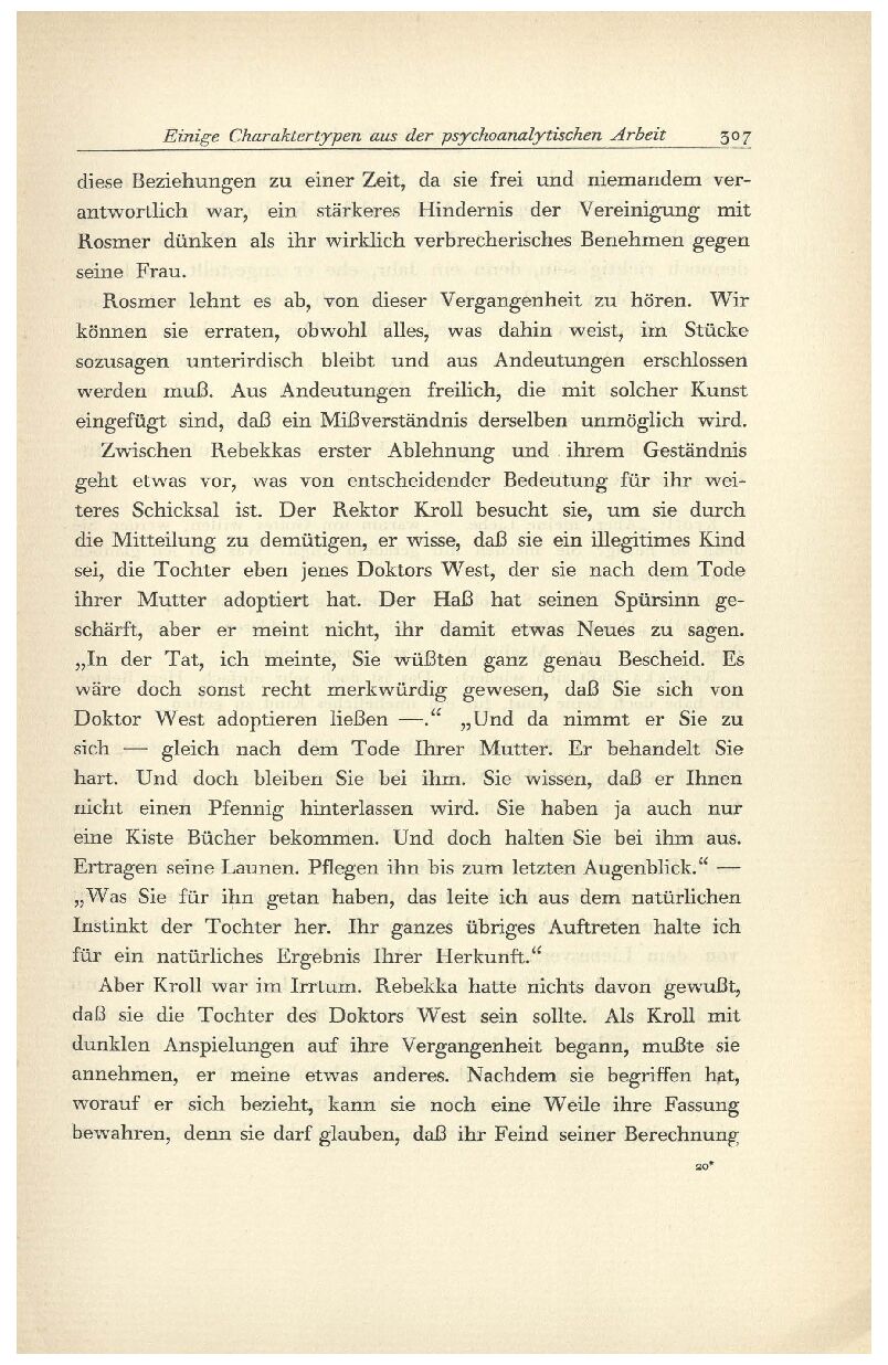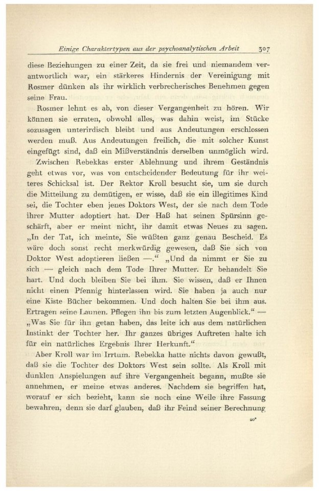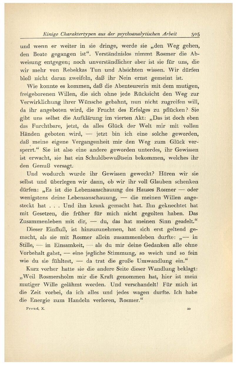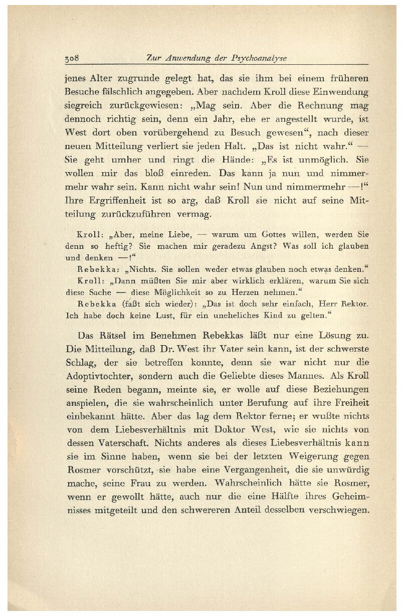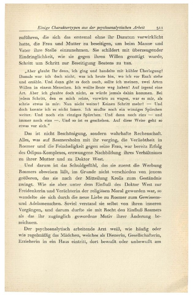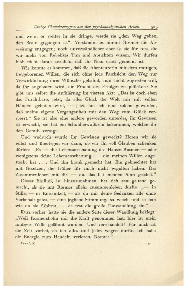 Das ist nicht Beschönigung, sondern wahrhafte Rechenschaft. Alles, was auf Rosmersholm mit ihr vorging, die Verliebtheit in Rosmer und die Feindseligkeit gegen seine Frau, war bereits Erfolg des Ödipus-Komplexes, erzwungene Nachbildung ihres Verhältnisses zu ihrer Mutter und zu Dr. West.