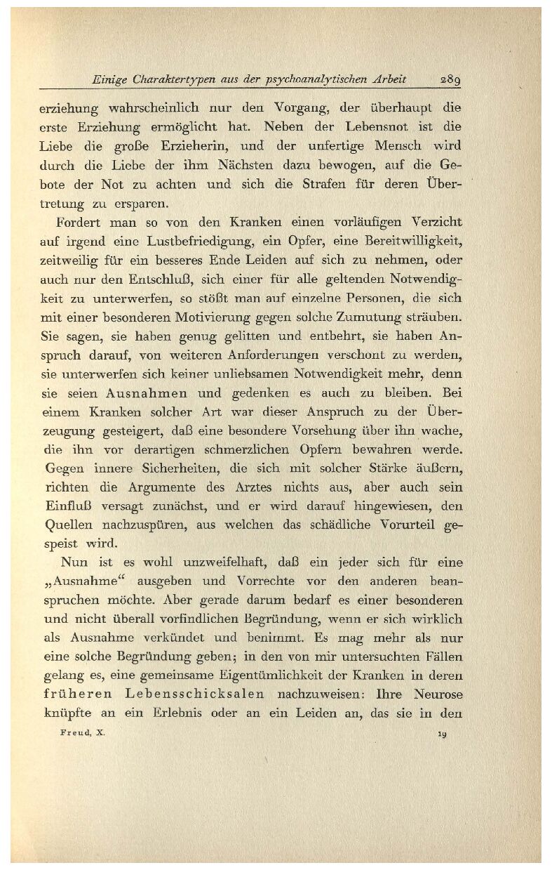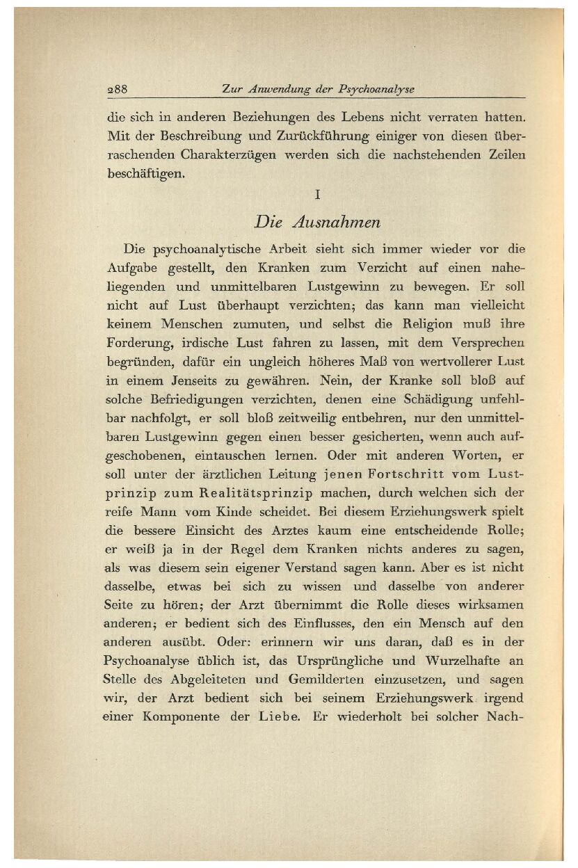 Die AusnahmenDie psychoanalytische Arbeit sieht sich immer wieder vor die Aufgabe gestellt, den Kranken zum Verzicht auf einen naheliegenden und unmittelbaren Lustgewinn zu bewegen. Er soll nicht auf Lust überhaupt verzichten; das kann man vielleicht keinem Menschen zumuten, und selbst die Religion muß ihre Forderung, irdische Lust fahrenzulassen, mit dem Versprechen begründen, dafür ein ungleich höheres Maß von wertvollerer Lust in einem Jenseits zu gewähren. Nein, der Kranke soll bloß auf solche Befriedigungen verzichten, denen eine Schädigung unfehlbar nachfolgt, er soll bloß zeitweilig entbehren, nur den unmittelbaren Lustgewinn gegen einen besser gesicherten, wenn auch aufgeschobenen, eintauschen lernen. Oder mit anderen Worten, er soll unter der ärztlichen Leitung jenen Fortschritt vom Lustprinzip zum Realitätsprinzip machen, durch welchen sich der reife Mann vom Kinde scheidet. Bei diesem Erziehungswerk spielt die bessere Einsicht des Arztes kaum eine entscheidende Rolle; er weiß ja in der Regel dem Kranken nichts anderes zu sagen, als was diesem sein eigener Verstand sagen kann. Aber es ist nicht dasselbe, etwas bei sich zu wissen und dasselbe von anderer Seite zu hören; der Arzt übernimmt die Rolle dieses wirksamen anderen; er bedient sich des Einflusses, den ein Mensch auf den anderen ausübt. Oder: erinnern wir uns daran, daß es in der Psychoanalyse üblich ist, das Ursprüngliche und Wurzelhafte anstelle des Abgeleiteten und Gemilderten einzusetzen, und sagen wir, der Arzt bedient sich bei seinem Erziehungswerk irgendeiner Komponente der Liebe. Er wiederholt bei solcher Nacherziehung