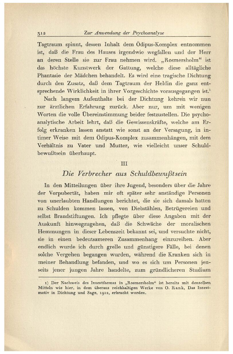 Die Verbrecher aus SchuldbewußtseinIn den Mitteilungen über ihre Jugend, besonders über die Jahre der Vorpubertät, haben mir oft später sehr anständige Personen von unerlaubten Handlungen berichtet, die sie sich damals hatten zuschulden kommen lassen, von Diebstählen, Betrügereien und selbst Brandstiftungen. Ich pflegte über diese Angaben mit der Auskunft hinwegzugehen, daß die Schwäche der moralischen Hemmungen in dieser Lebenszeit bekannt sei, und versuchte nicht, sie in einen bedeutsameren Zusammenhang einzureihen. Aber endlich wurde ich durch grelle und günstigere Fälle, bei denen solche Vergehen begangen wurden, während die Kranken sich in meiner Behandlung befanden, und wo es sich um Personen jenseits jener jungen Jahre handelte, zum gründlicheren Studium